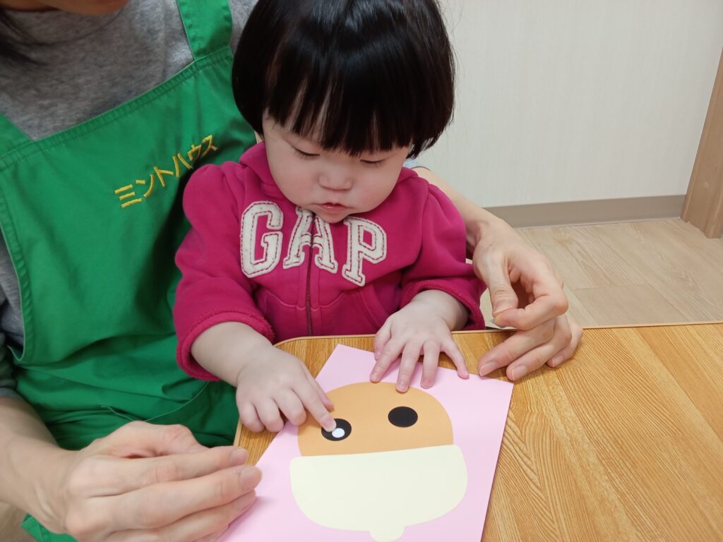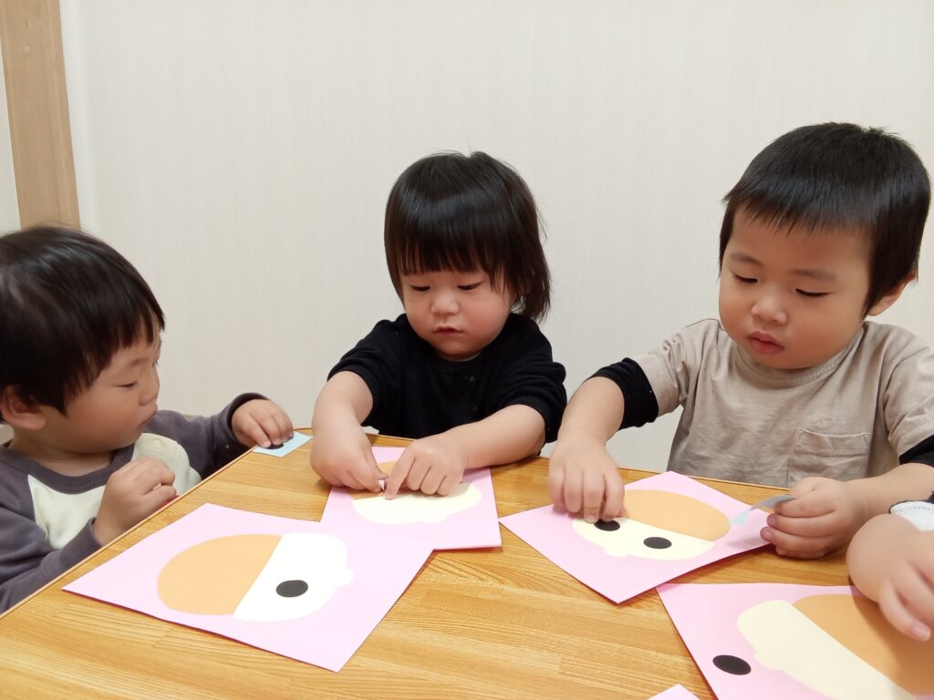 小さいグループさんは、顔のパーツをシールで貼りました。