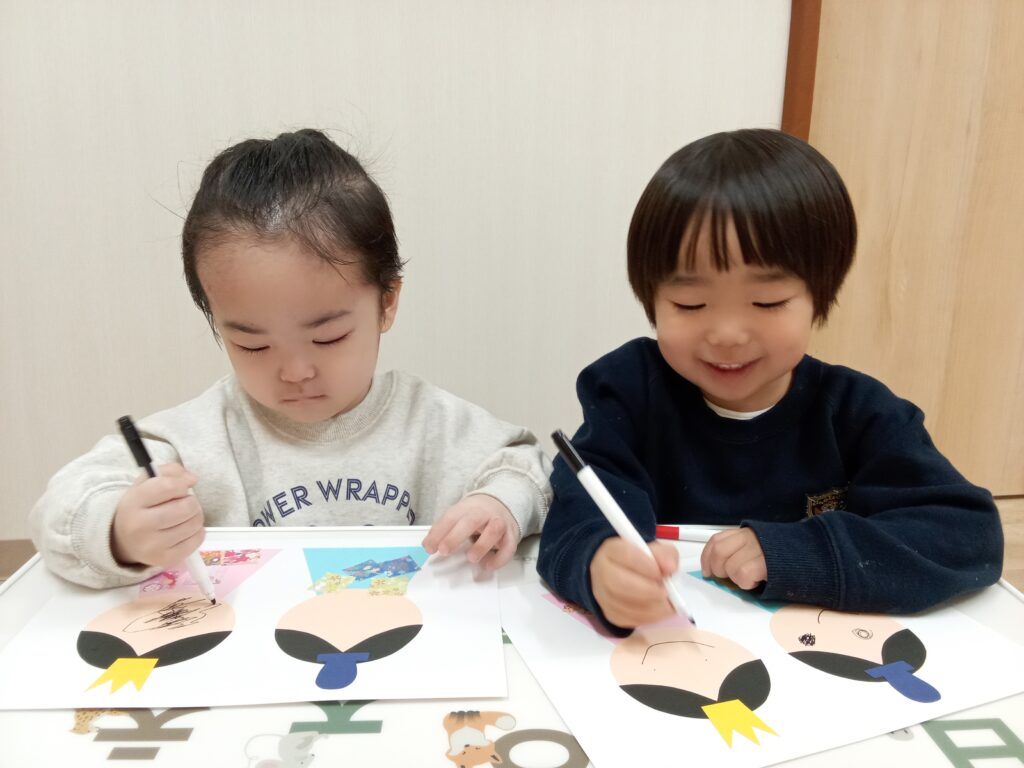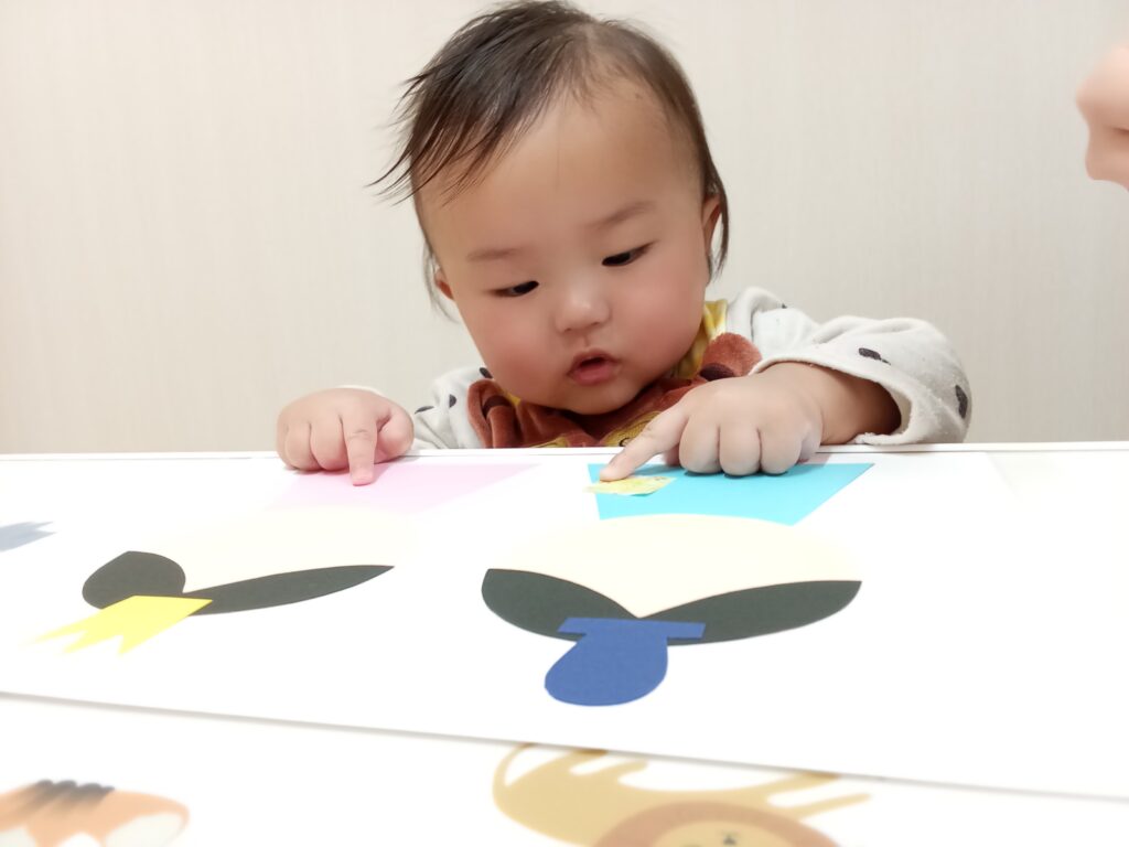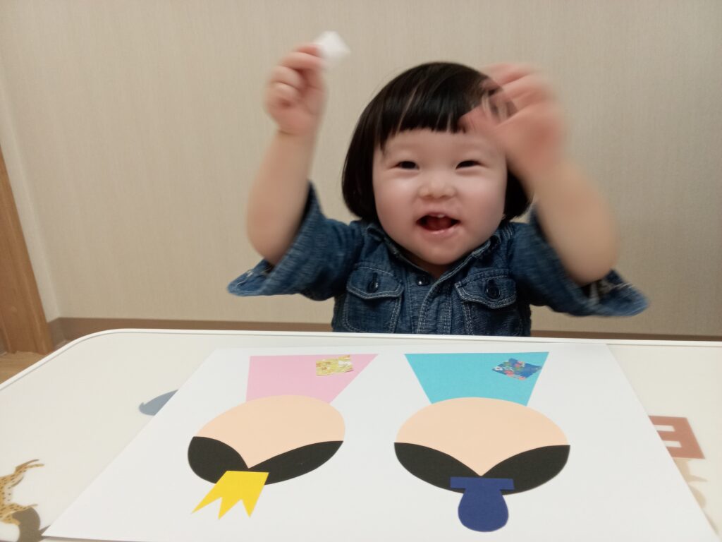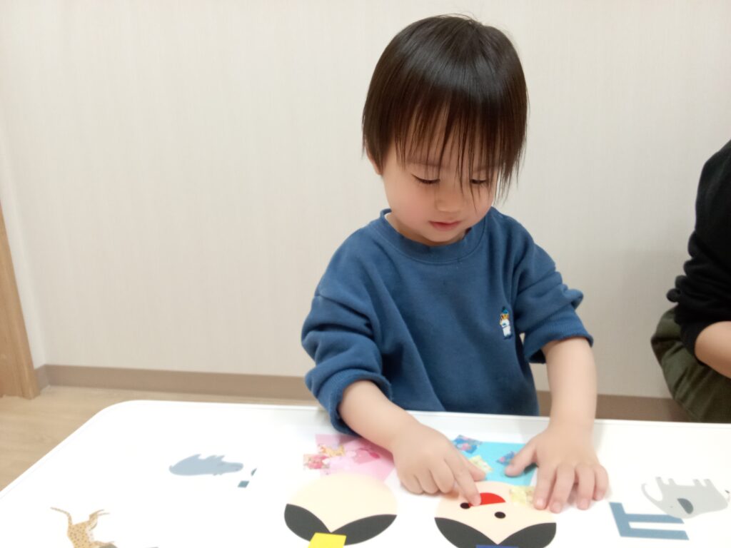 1人でまだ貼れない小さい子達も真似をして指を1本出して押さえたり、1枚貼れるごとに拍手をして喜んでいる子もいました😊