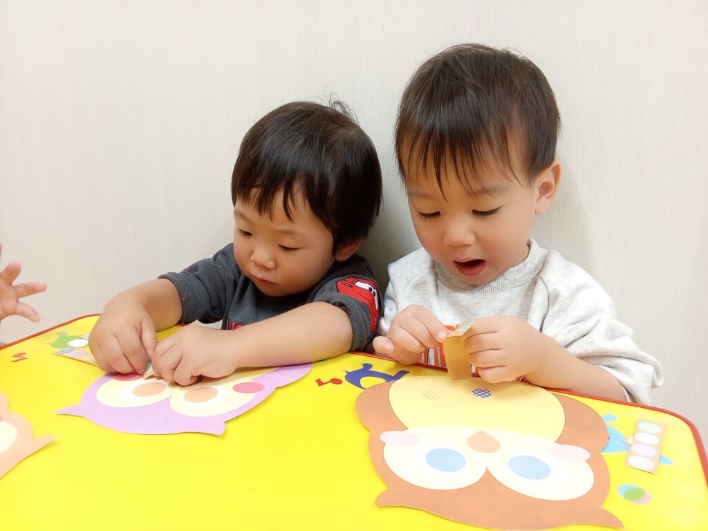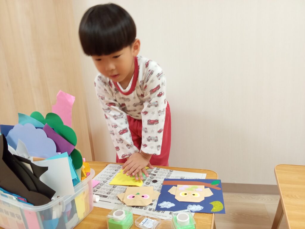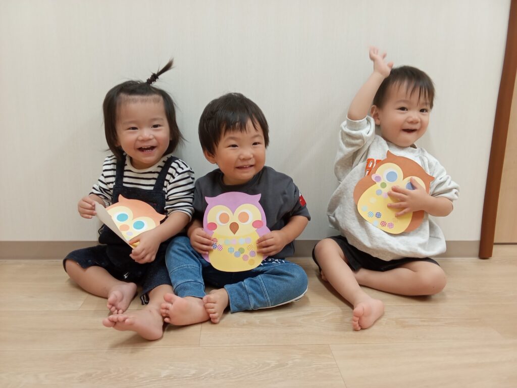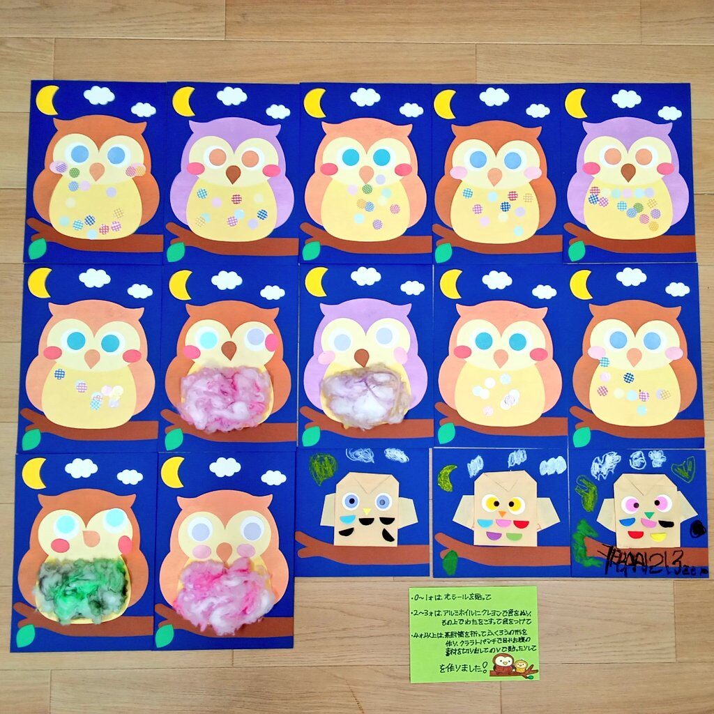 次は2~3歳のグループ🐰ふくろうの台紙に目や口ばしのパーツを貼ったり、アルミホイルにクレヨンで色をぬりその上から綿をこすって綿に色付けして作りました⭐️