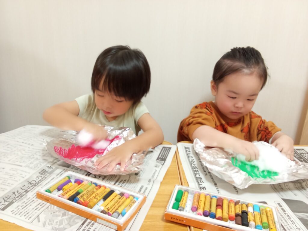 綿の時は「こしこし~🎵」とリズムを口ずさんだり力いっぱいこすったりとそれぞれに色付けを頑張っていました✨