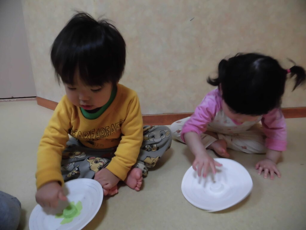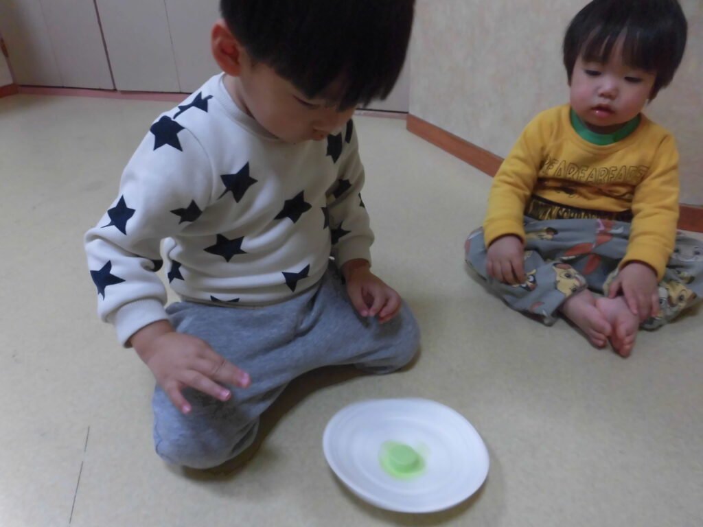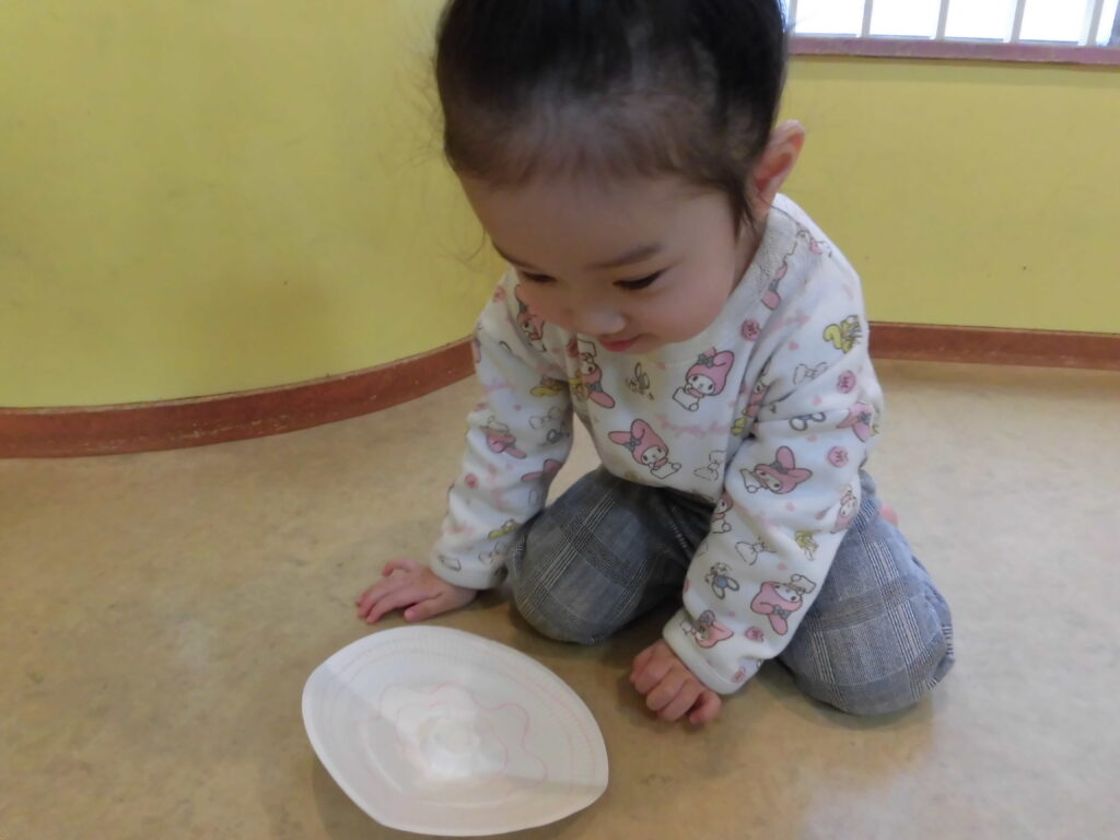 小さいグループさんは、紙皿で作ったコマでコマ回しをしました!真ん中のキャップを掴んだり、コマの周りを持ったりして、しっかり回せていました😊くるくる回るコマを見て何回も遊んでいました♡