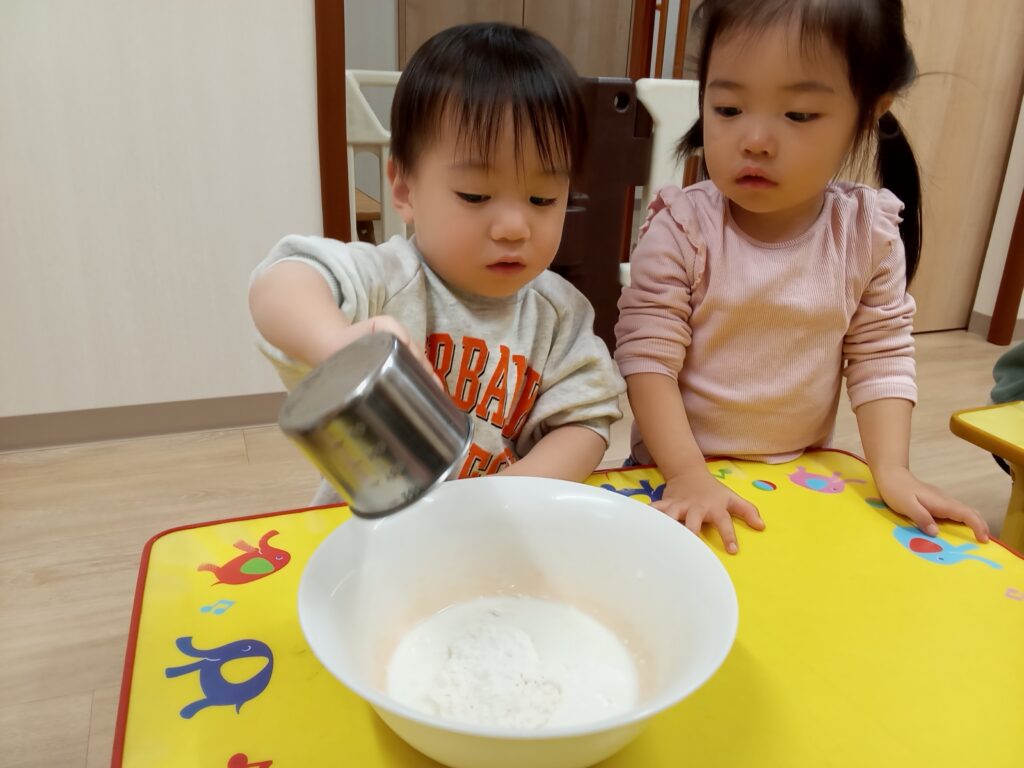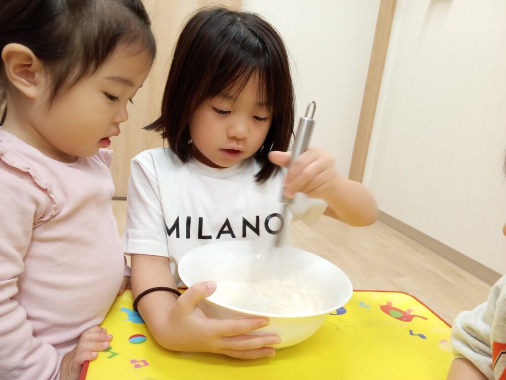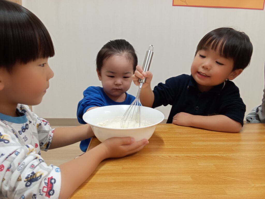 混ぜるのは何度かやった事がある子もいたので、こぼれないように丁寧に混ぜていました✨