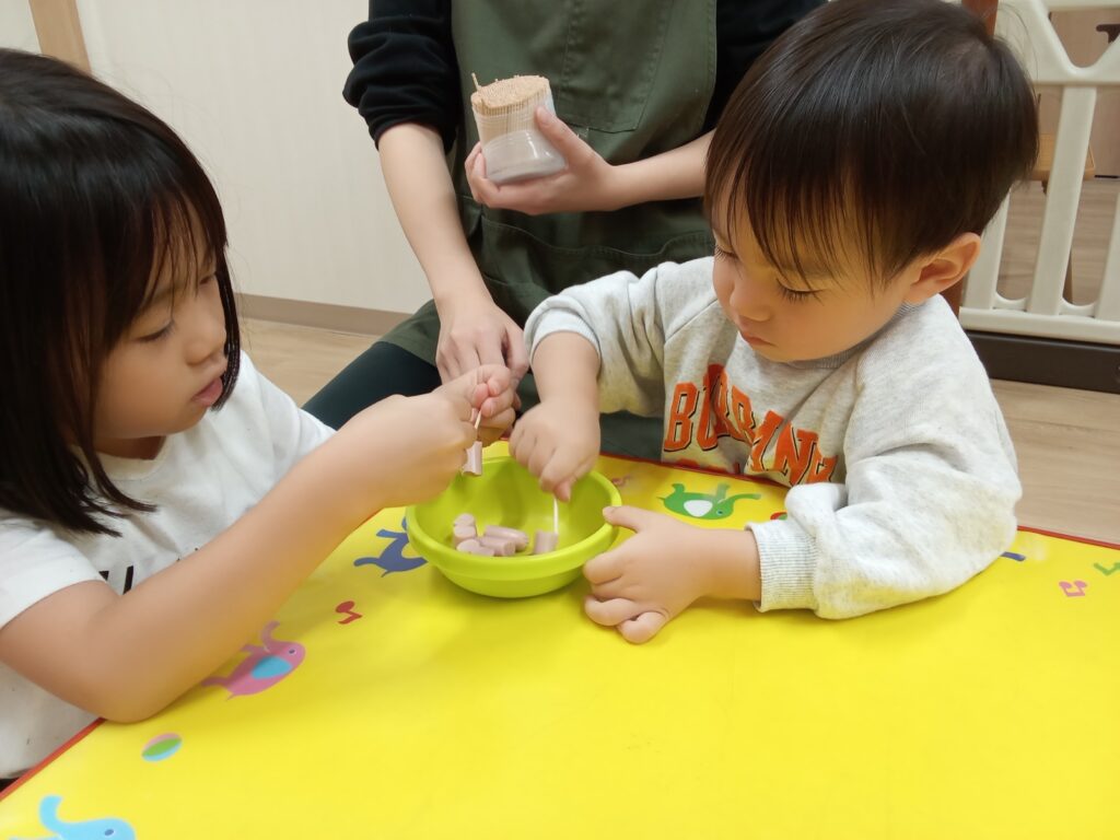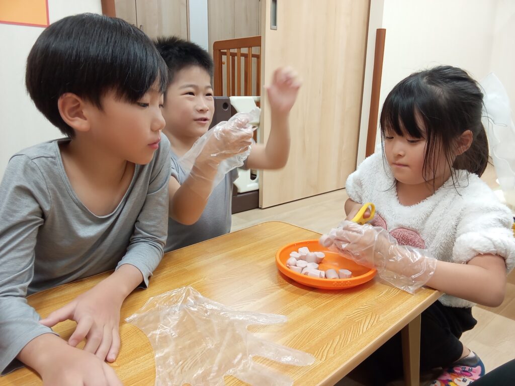 大きい子にハサミでソーセージを輪切りに切ってもらい、みんなで1つずつ爪楊枝を刺しました!
