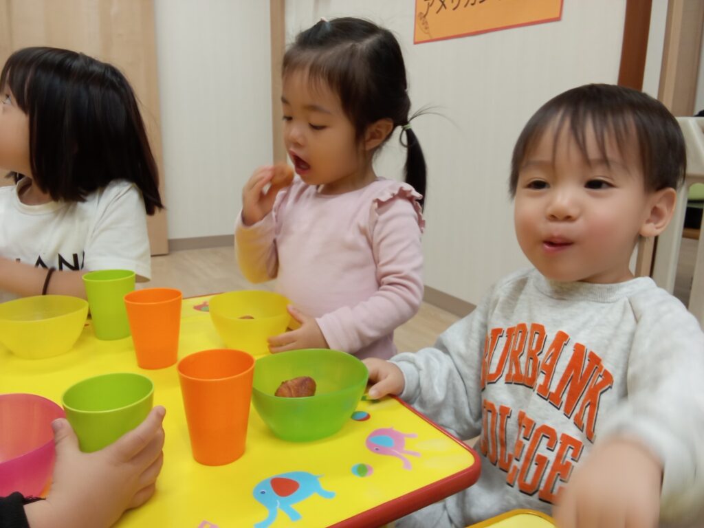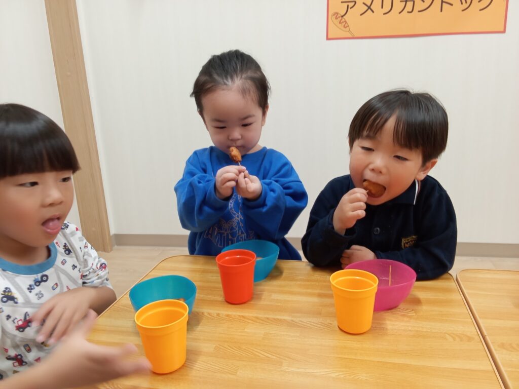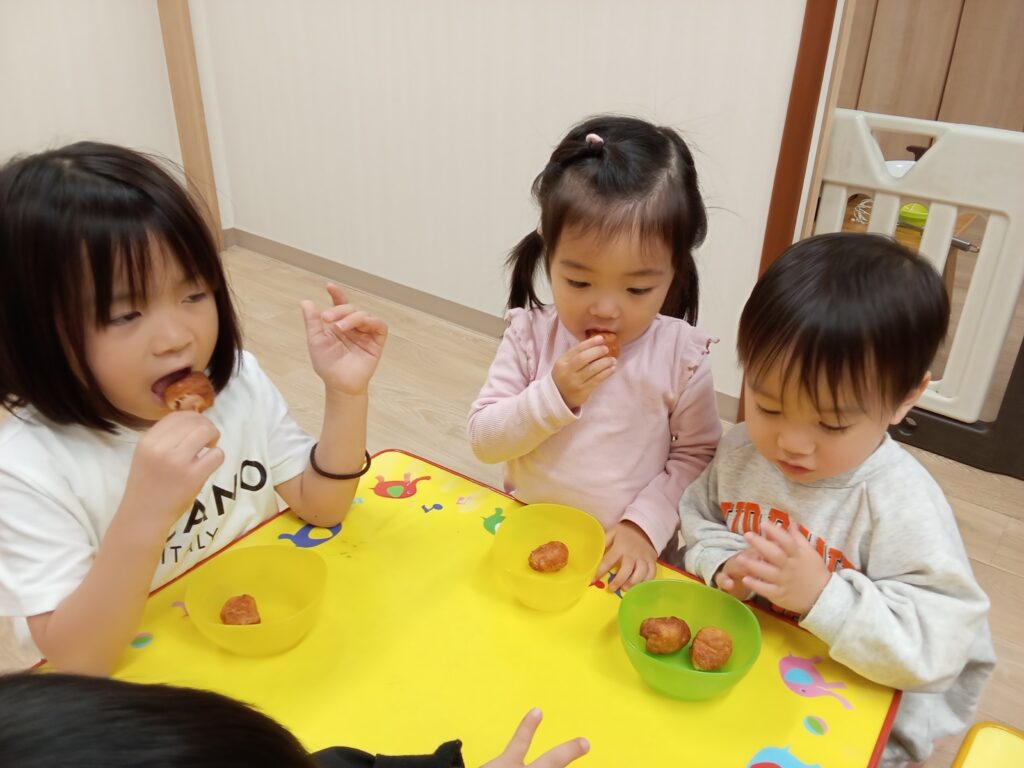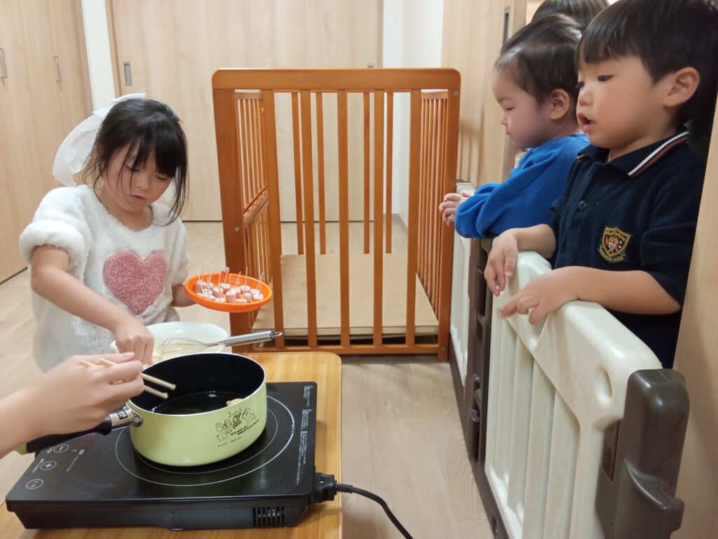 みんなが用意してくれた材料で保育士が揚げると、「おいしそう〜!」「いいにおい!」と揚げている所を見ていました❤️