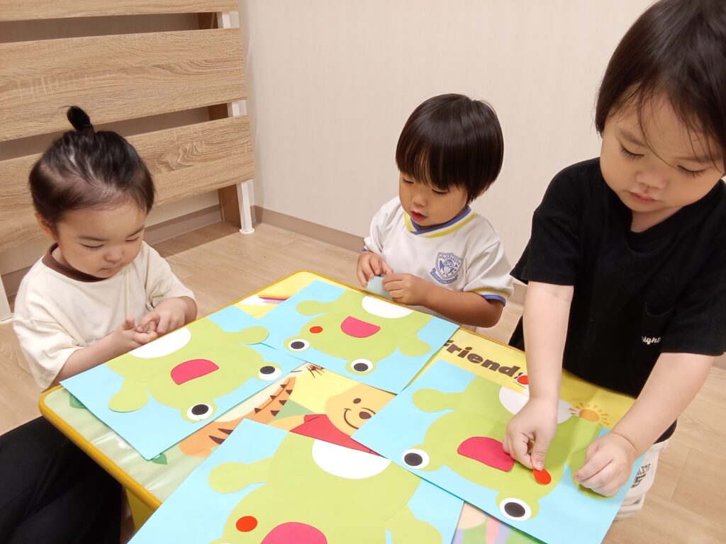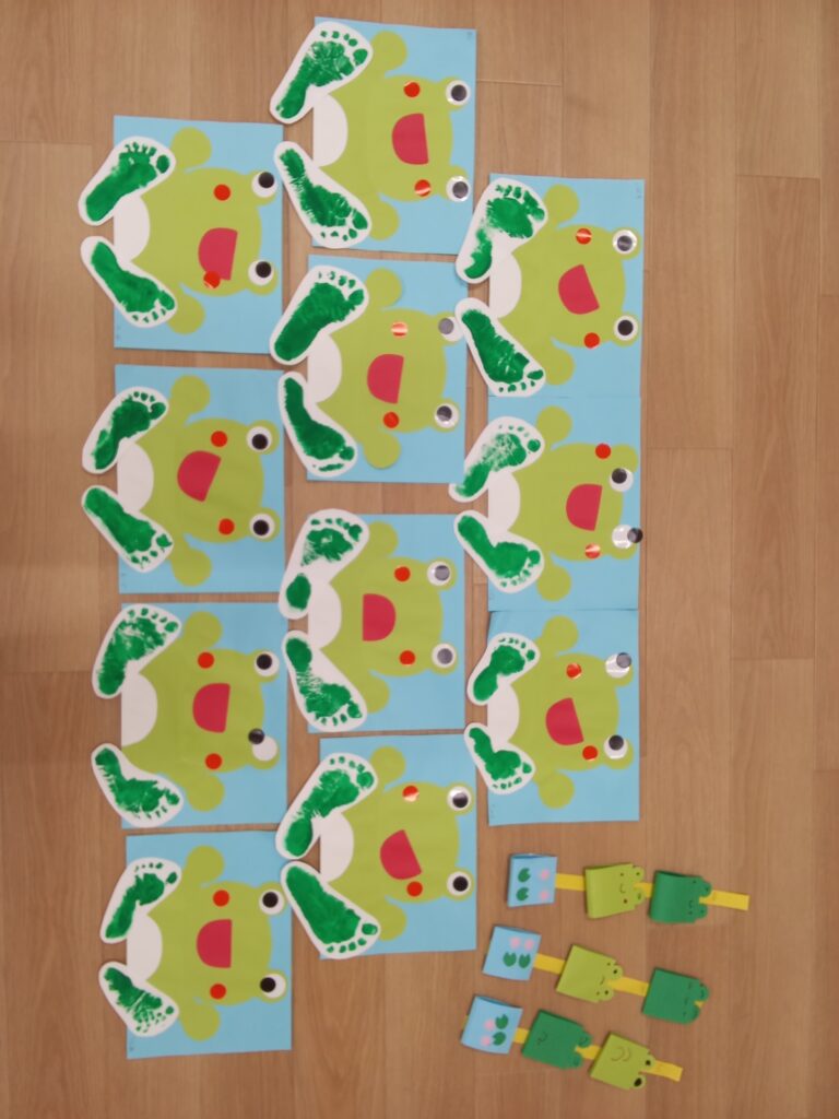 小さいグループさんは、足型を使ってカエルを作りました。