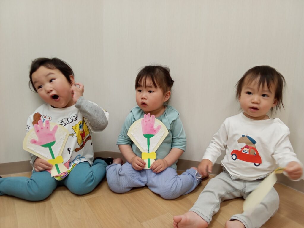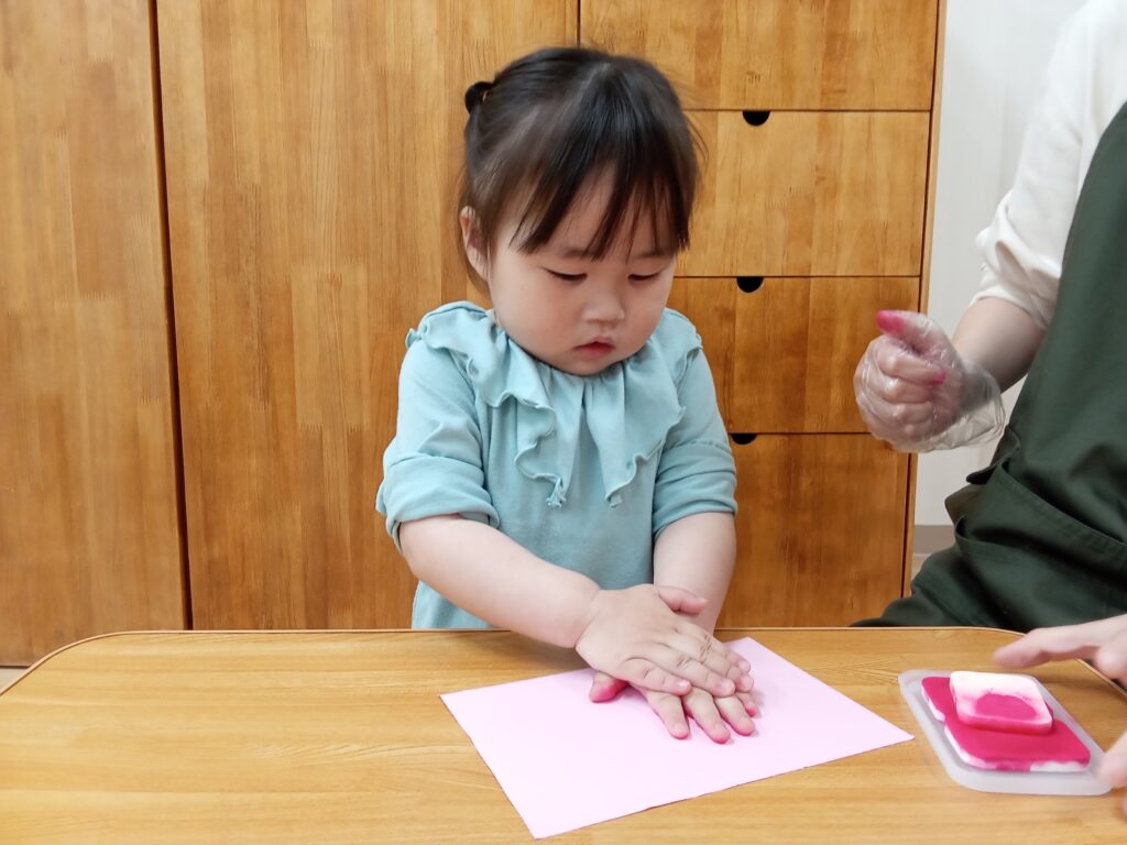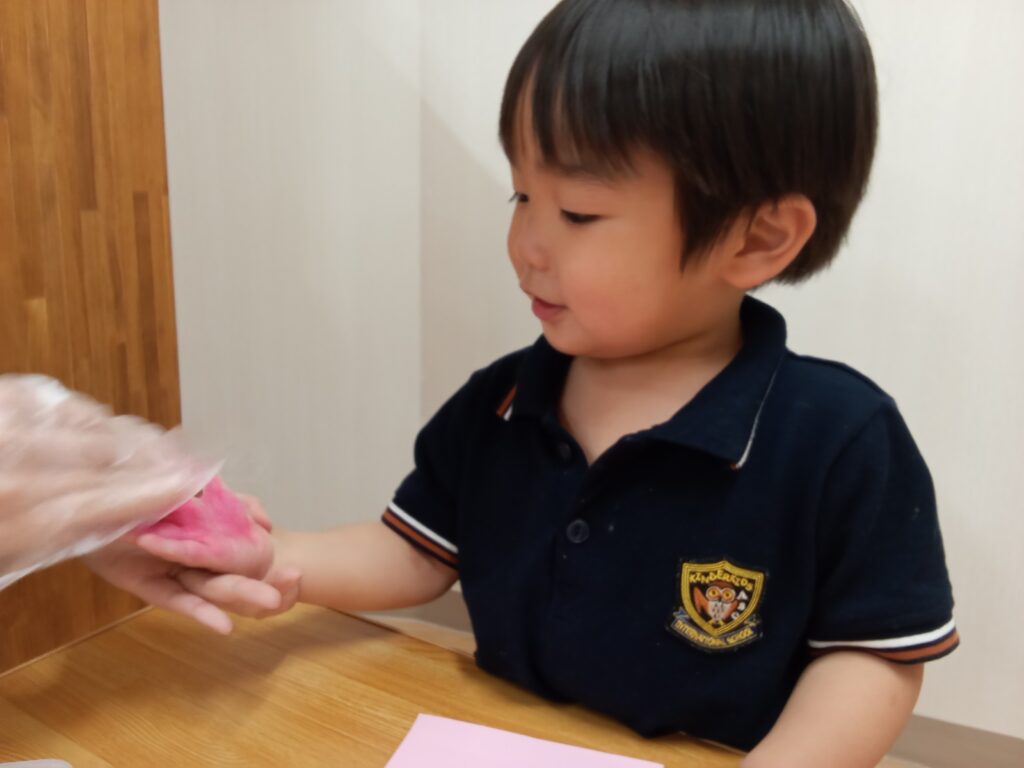 手にインクをつける時、嫌がらずにじーっと手のひらを見つめていたり、手がピンク色になっていくのが気になるのかグーパーと手を開いたり閉じたりをしていました😊