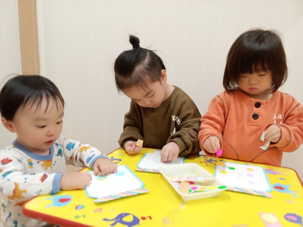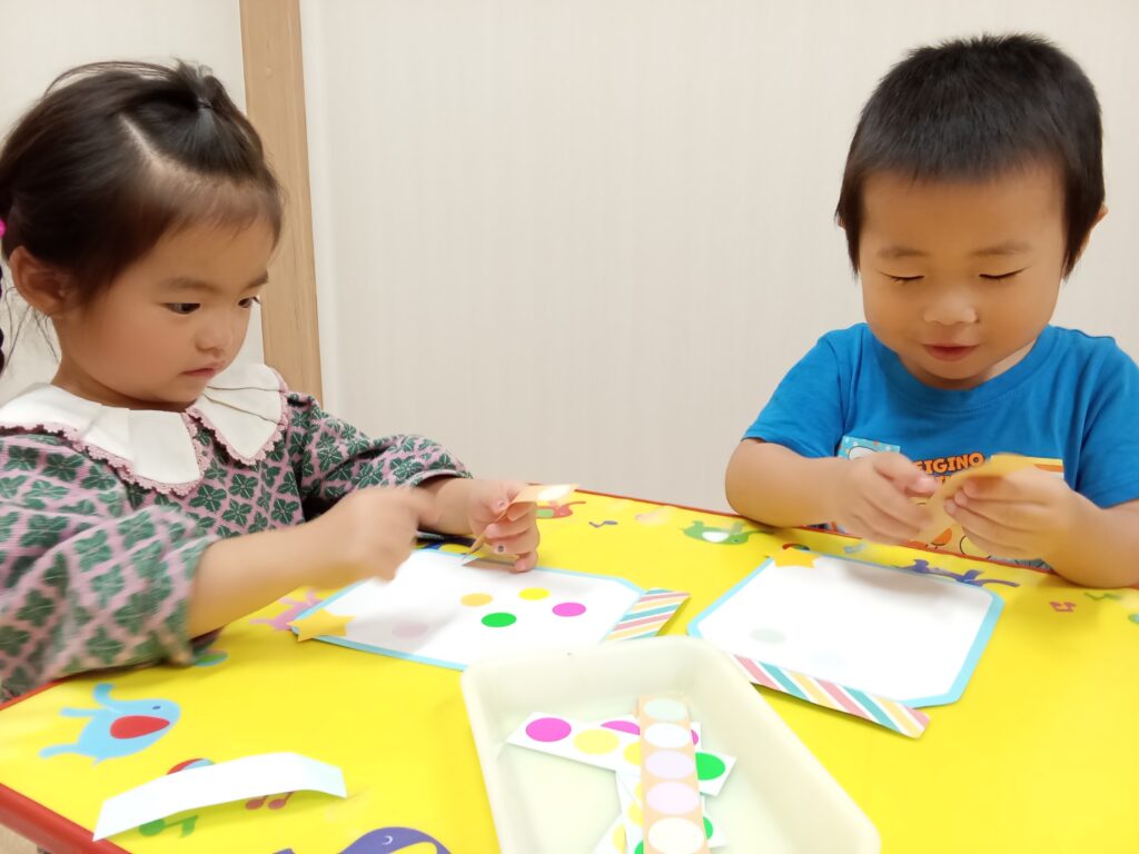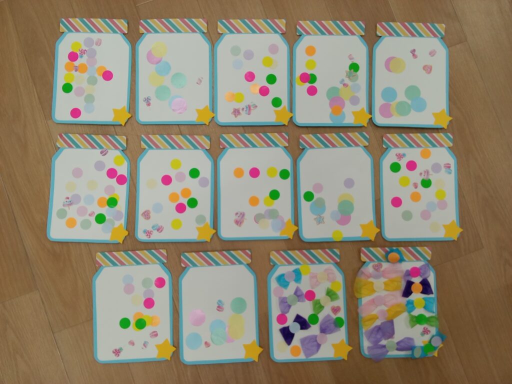 大きい子達はフラワーペーパーを捻って、その上からシールを貼ってキャンディを作り、台紙に貼り付けました😊
