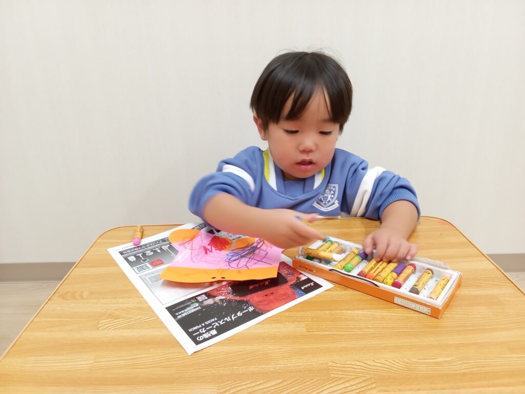 クレヨンの色から「これ❗️」「きいろ✨」などとしっかりと選び描いていた子ども達。飾りつけの素材を準備すると「うわぁー🤩」と嬉しそうにしてすぐ素材に手を伸ばして貼っていっていましたよ💕
