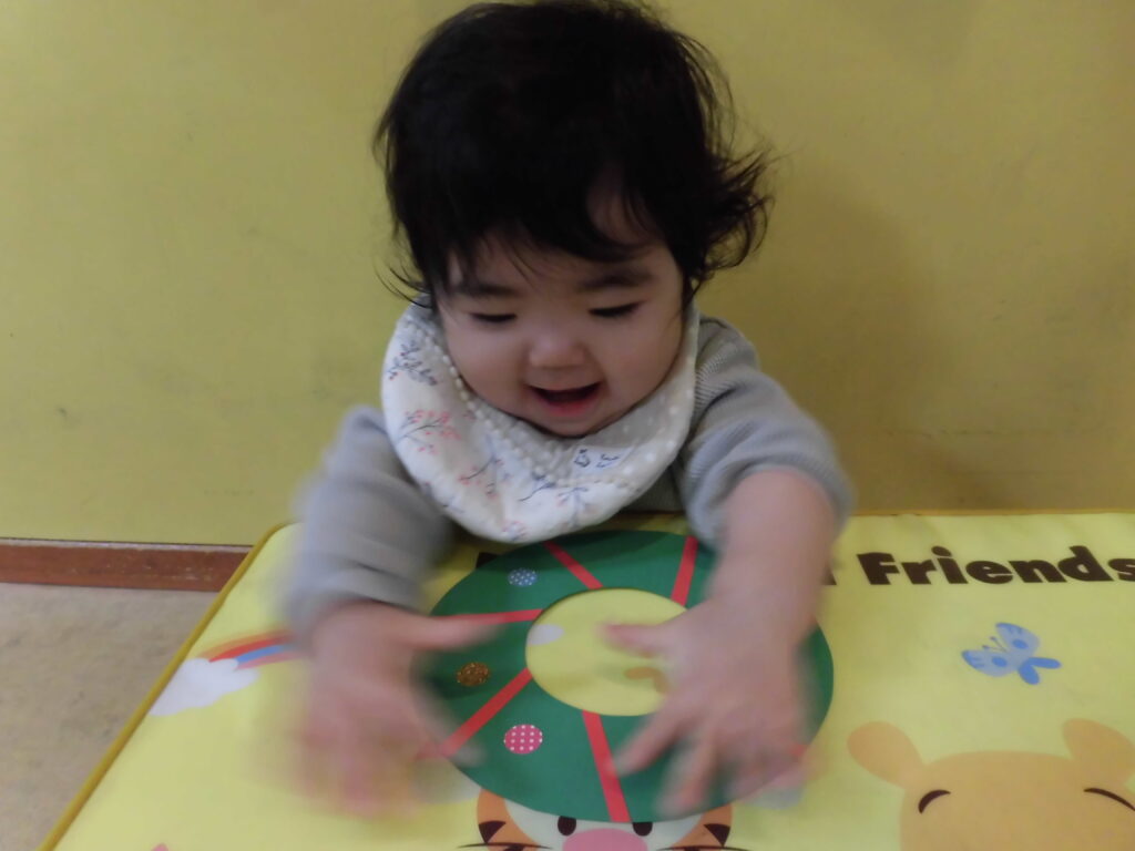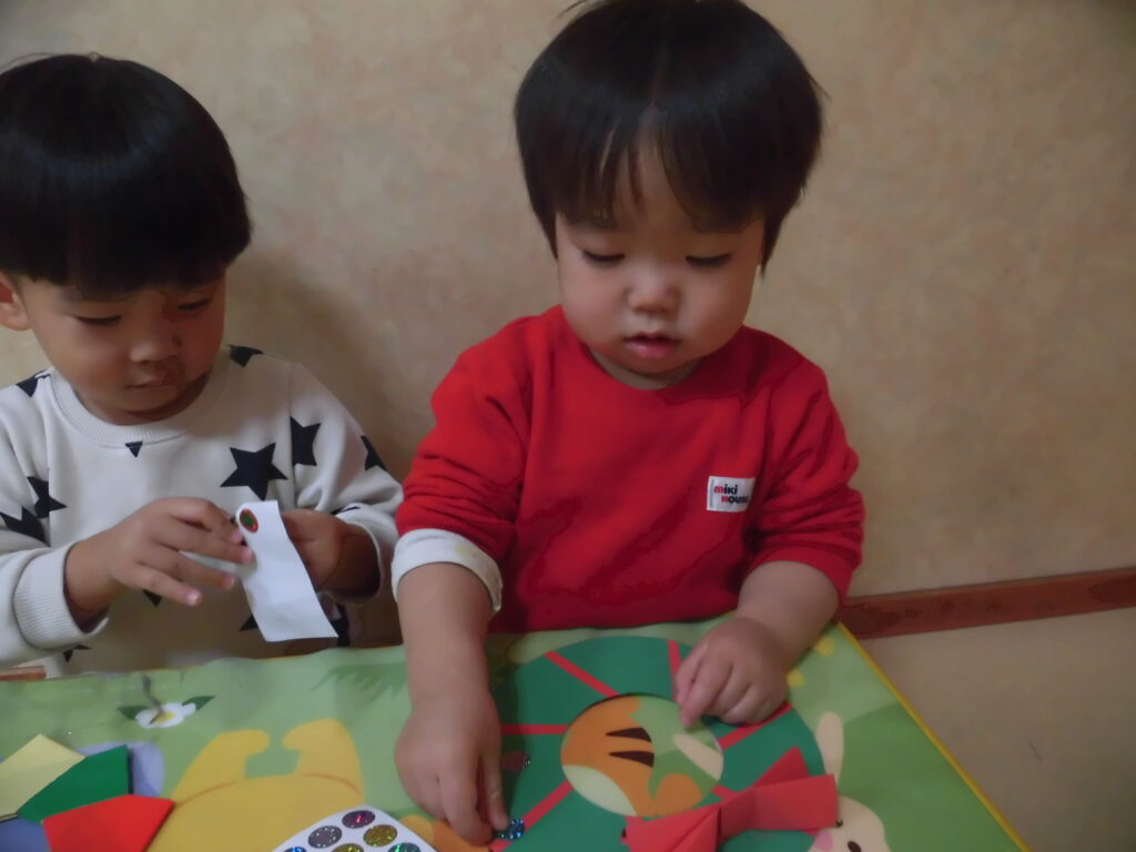0〜2歳のグループは、リース型の画用紙にシールを貼って可愛く飾り付けました!好きなところに上手にペタペタ貼れていました♡