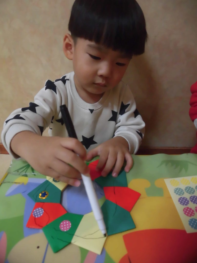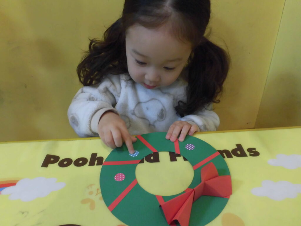 3〜4歳のグループは、折り紙で作ったリースにシールを貼ったりペンで好きな絵を描いて、綺麗に完成させていましたよ😊