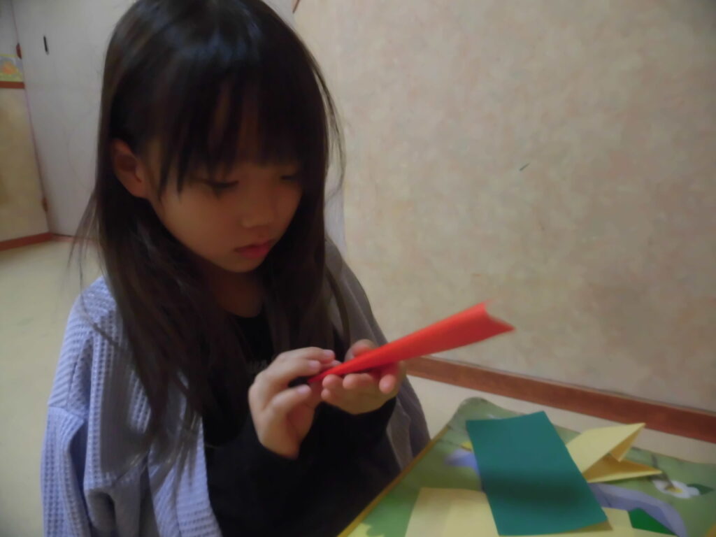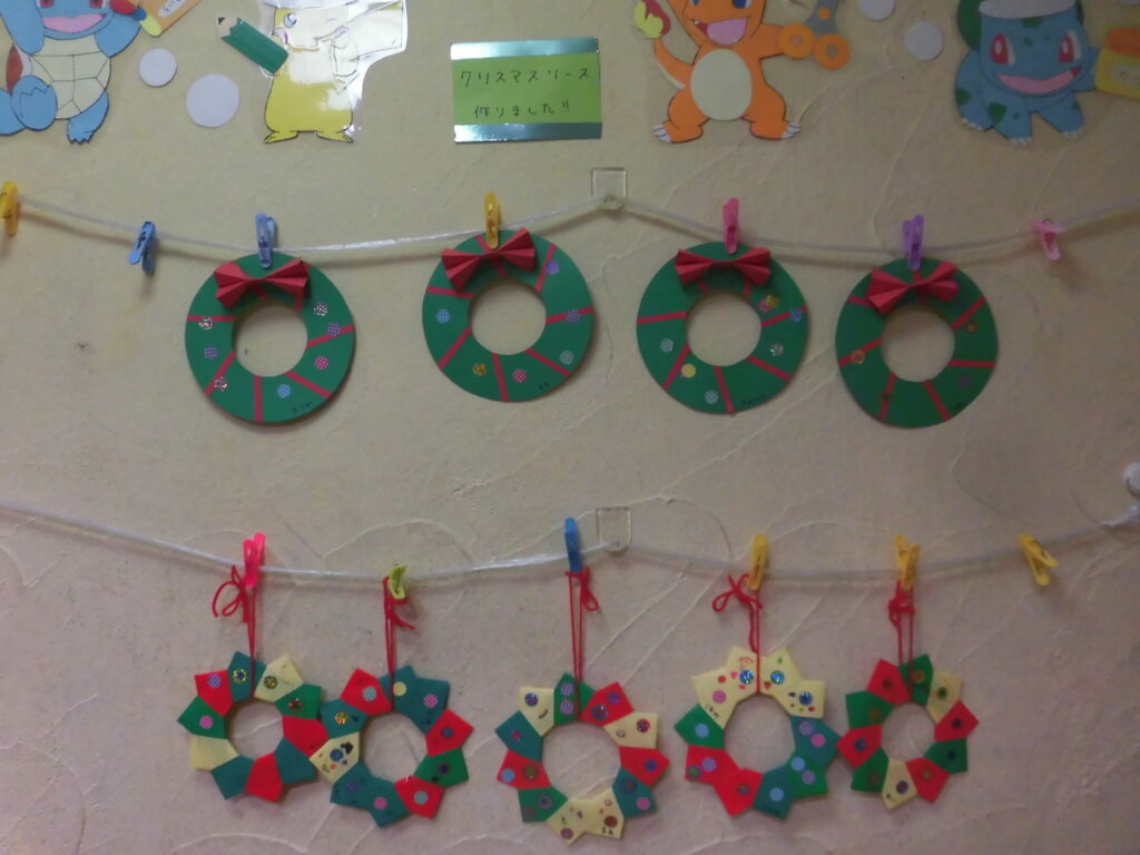 5歳以上のグループは、折り紙を折り繋げて、リースを作りました!少し難しいようでしたが、お友達と協力してそれぞれ満足いくように飾り付けしました❤️