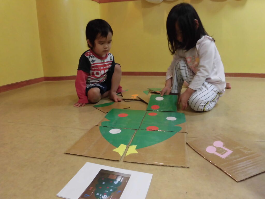 大きいグループさんは、クリスマスツリーのジャンボパズルをしました。