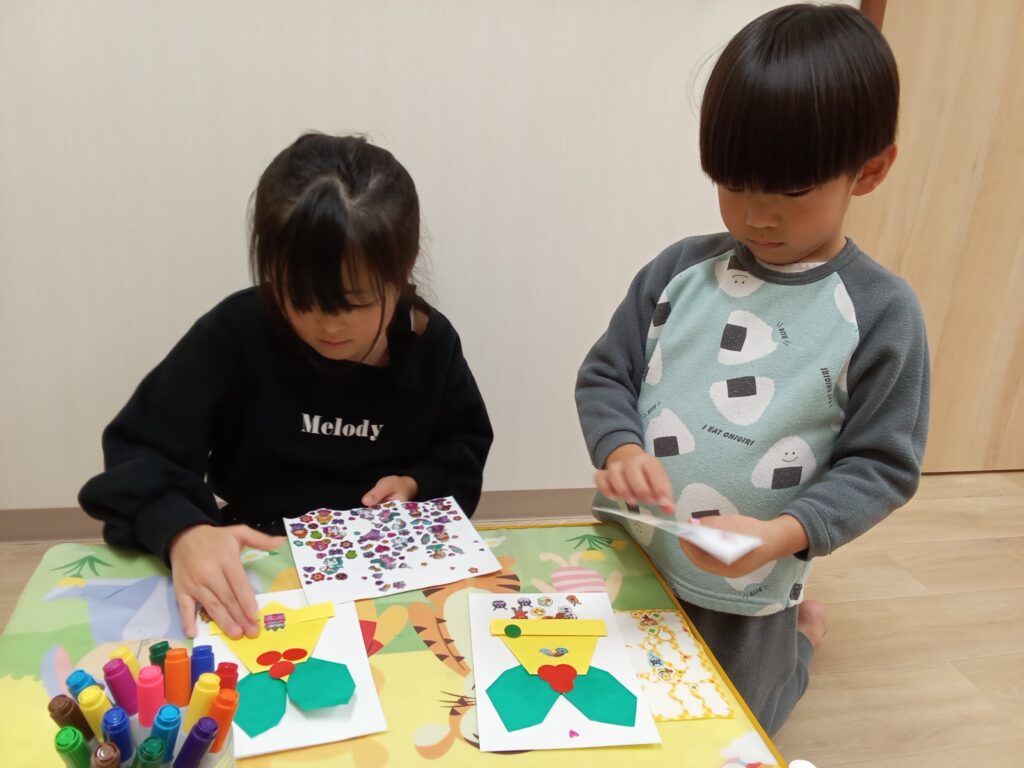 ベルにシールを貼って派手にクリスマスカラーになるよう模様づけしました。