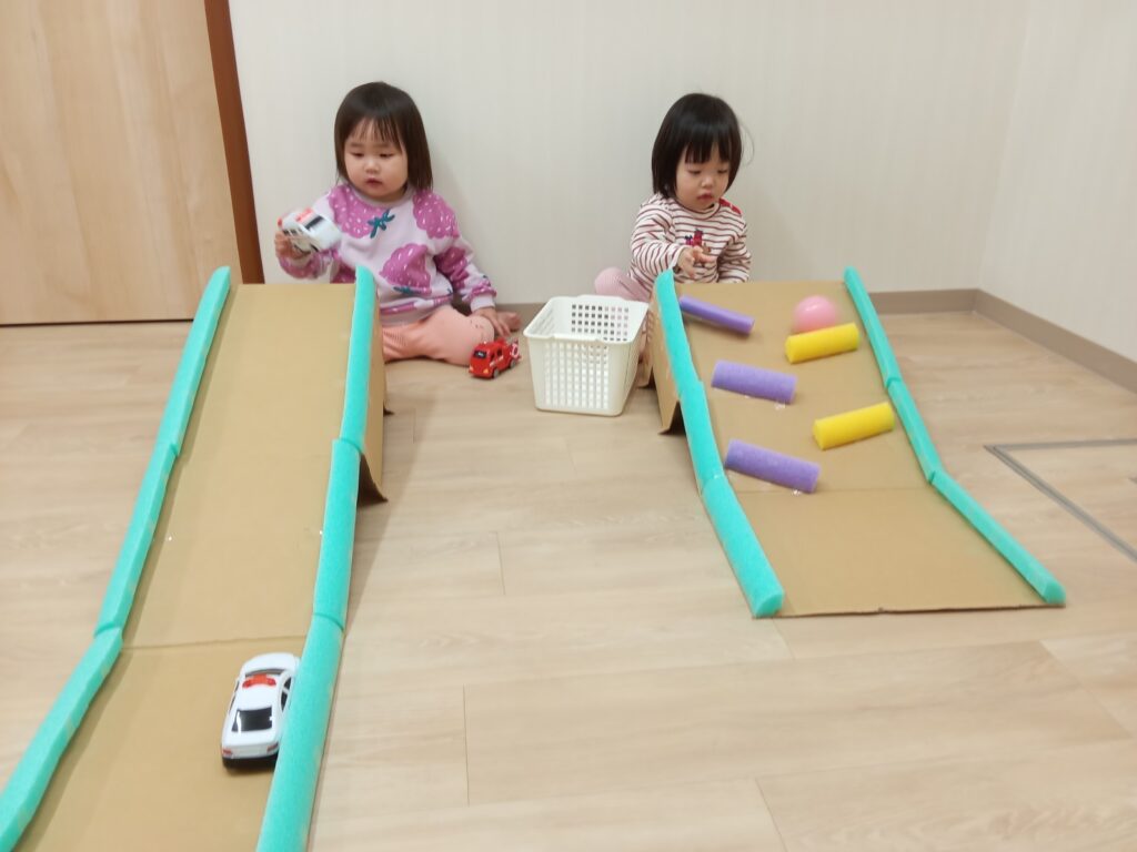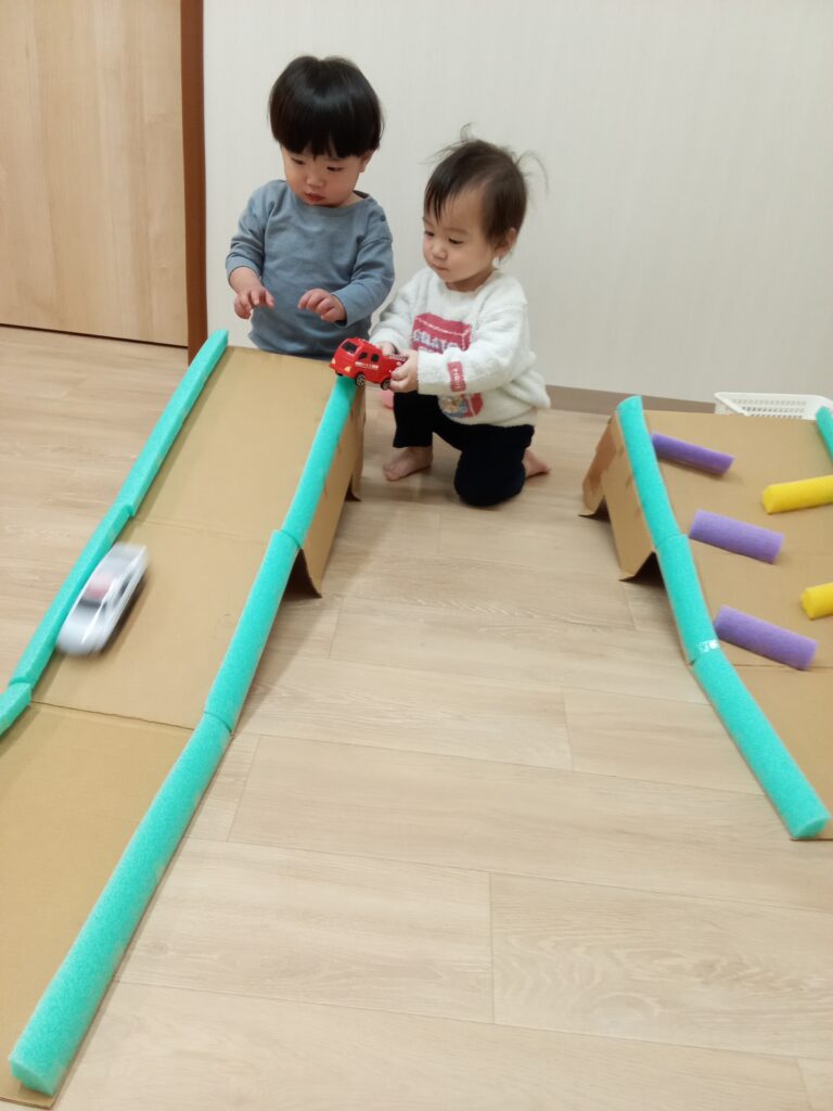 0~2歳のお友達は、パトカーなどの緊急車両やボール遊びが大好きなのでその2つを使って段ボールで作ったコロコロスロープで遊びました🚓🚑🚒✨