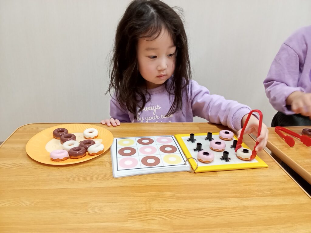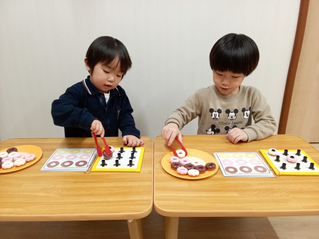 ドーナツのおもちゃを見本の絵の通りにトングを使って並べる知育遊びをしました🍩✨