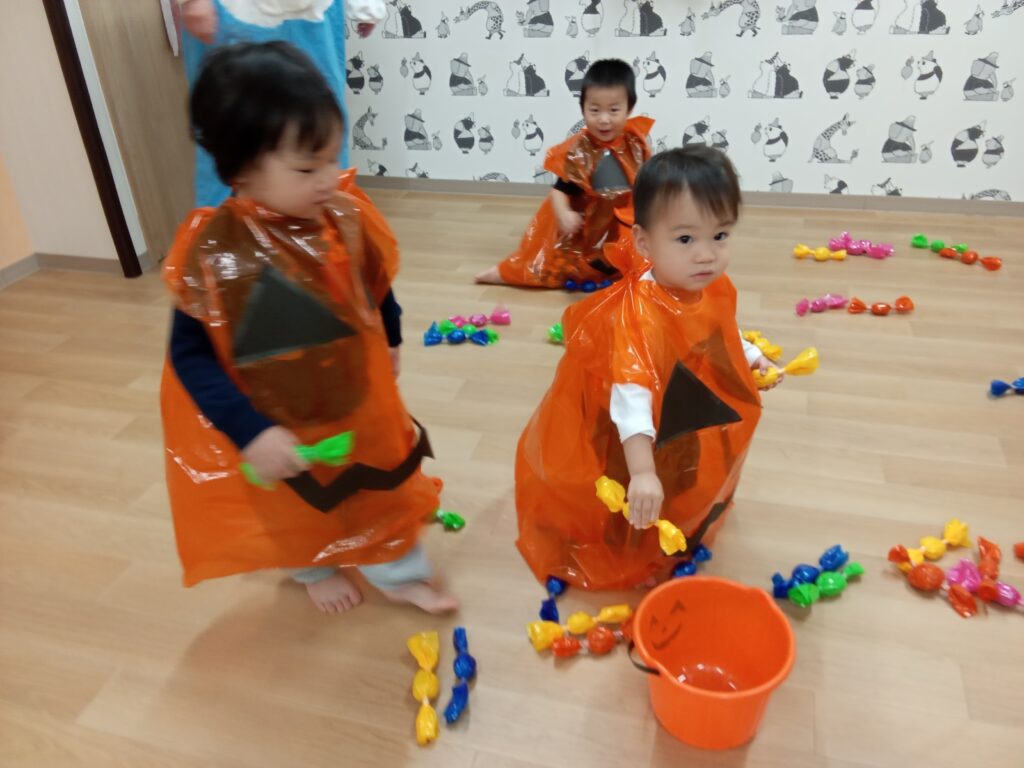 子ども達はビニール袋で作ったカボチャオバケの衣装を着てキャンディー集めしましたよ⭐️可愛いかったです❤️