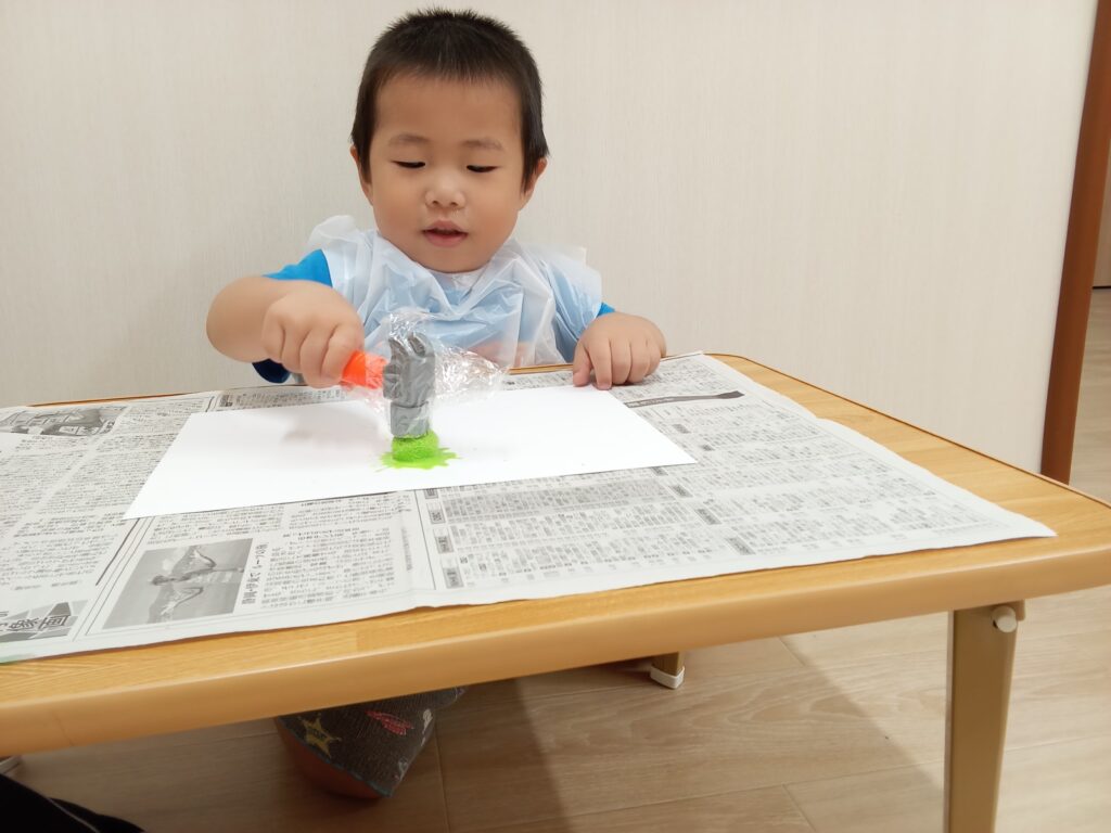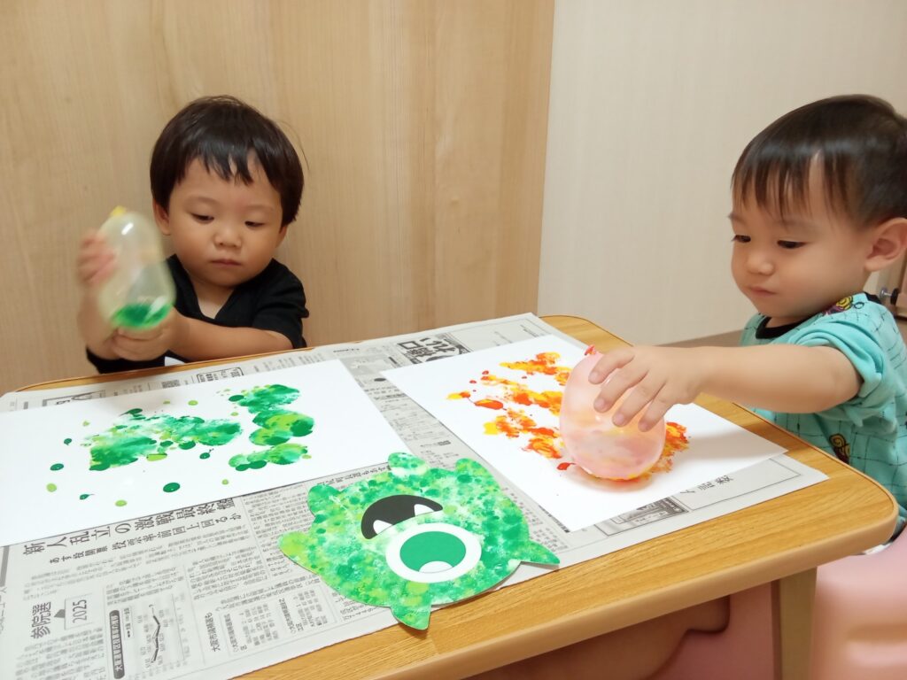始めは0~1歳のグループ🐭事前に絵具を画用紙に乗せ、風船をスタンプ代わりにポン♪ポン♪ポン♪と絵具を広げて作りました⭐️