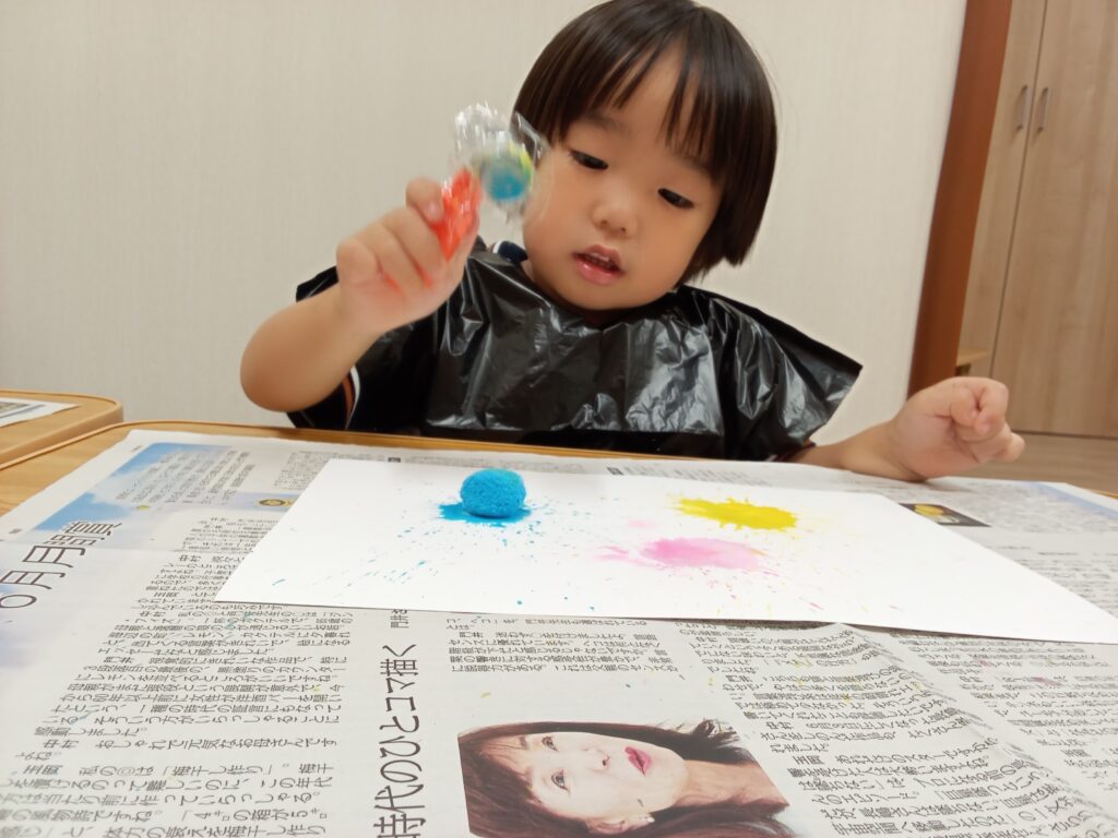 次は2~3歳のグループ🐰絵の具に浸したデコレーションボールをおもちゃのハンマーで叩き、絵の具を広げて作りました⭐️