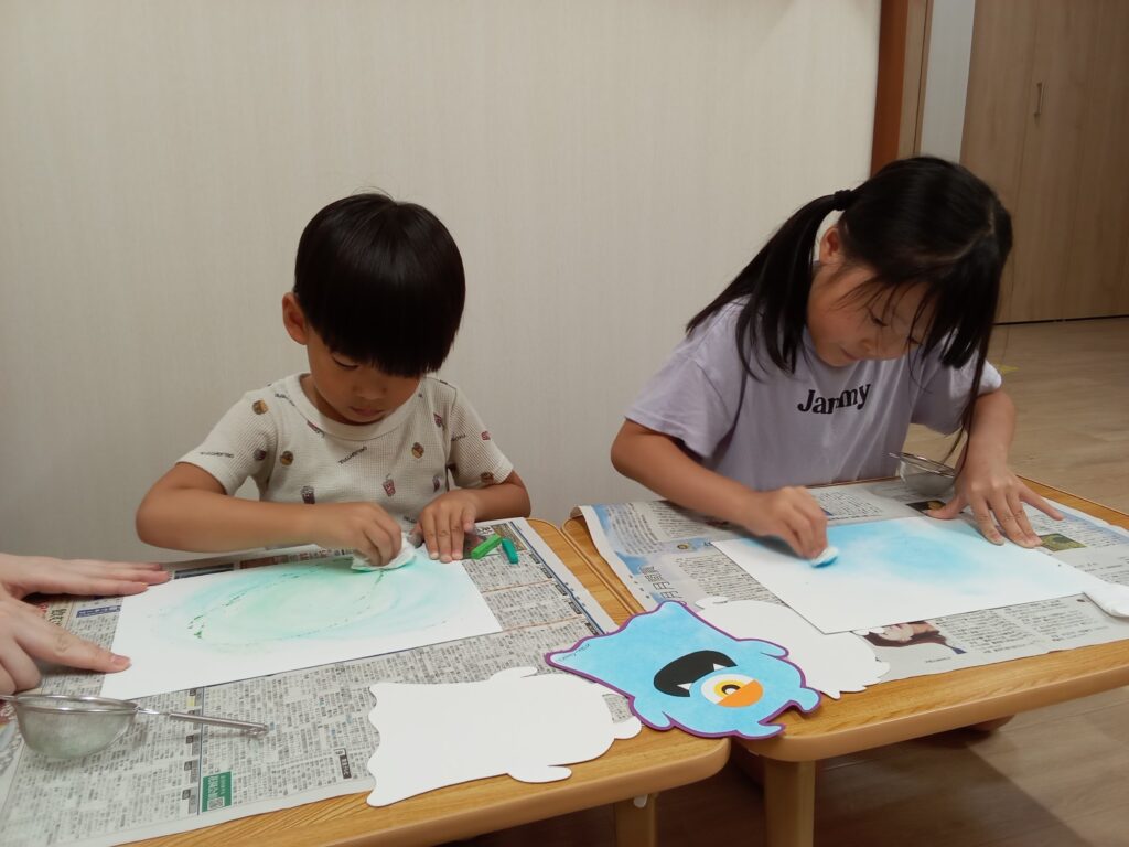 最後は4歳以上のグループ🦁パステルを茶こしで削り、テッシュペーパーで伸ばして画用紙に色を塗って作りました⭐️