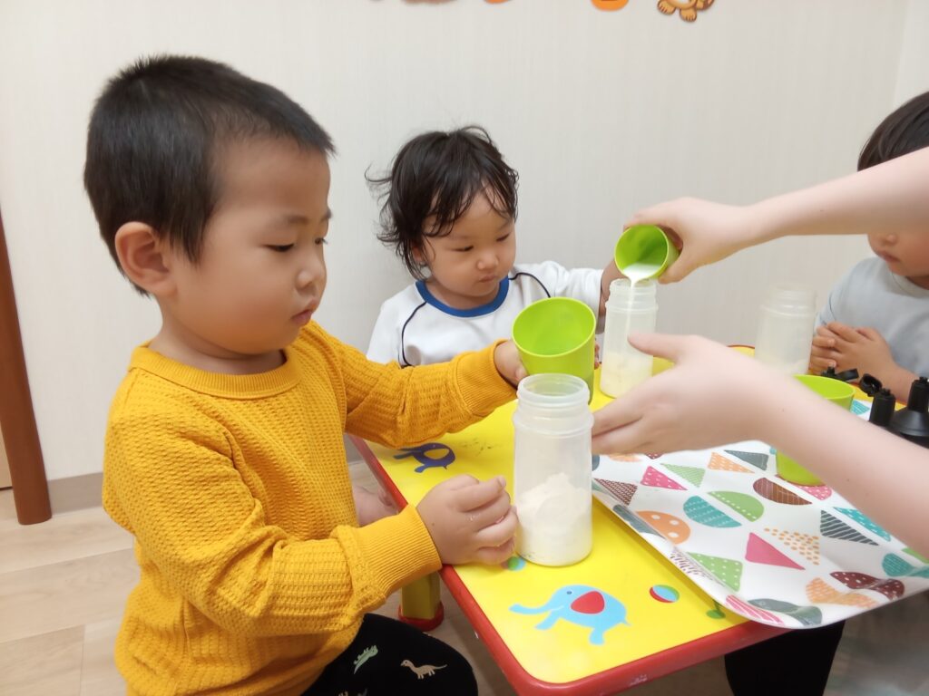 始めは2~3歳のグループ🐰ホットケーキミックスが入ったオイルボトルにコップに入っている牛乳を入れて蓋を閉め、シェイクしてもらいました⭐️
