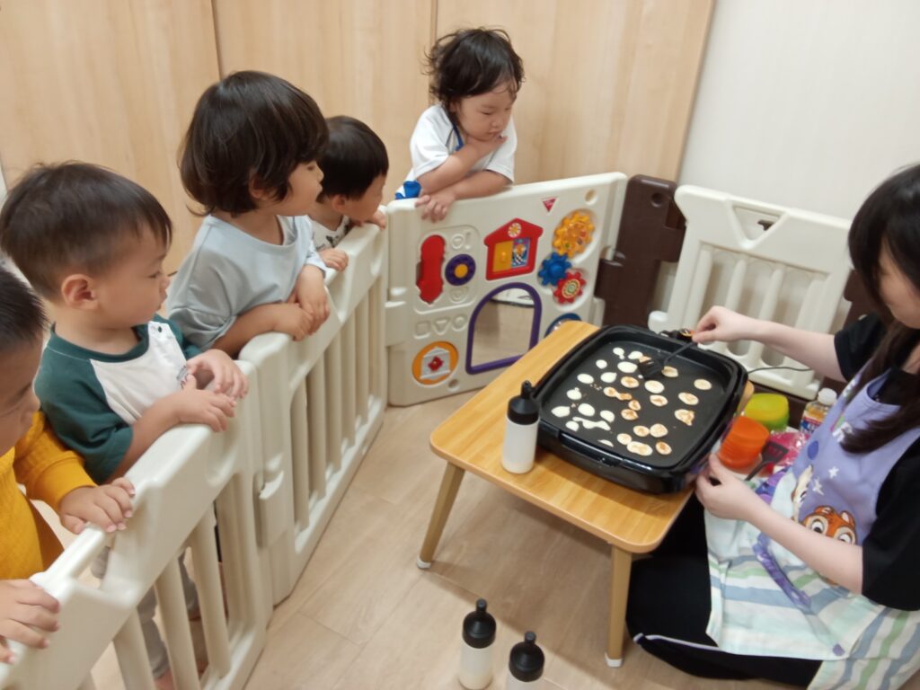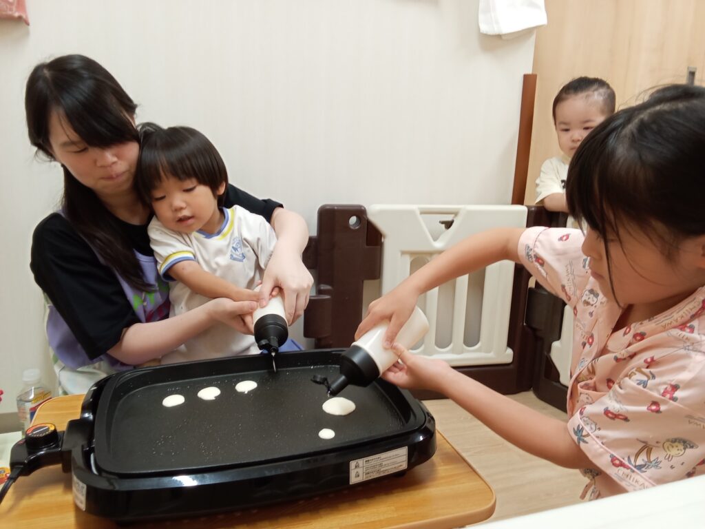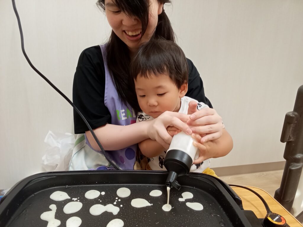 焼く作業は安全のため保育士が担当したのですが生地をひっくり返すと「おぉー‼️」と歓声をあげたり「おいしそう✨」と嬉しそうにみたりして完成をまちわびていましたよ😚