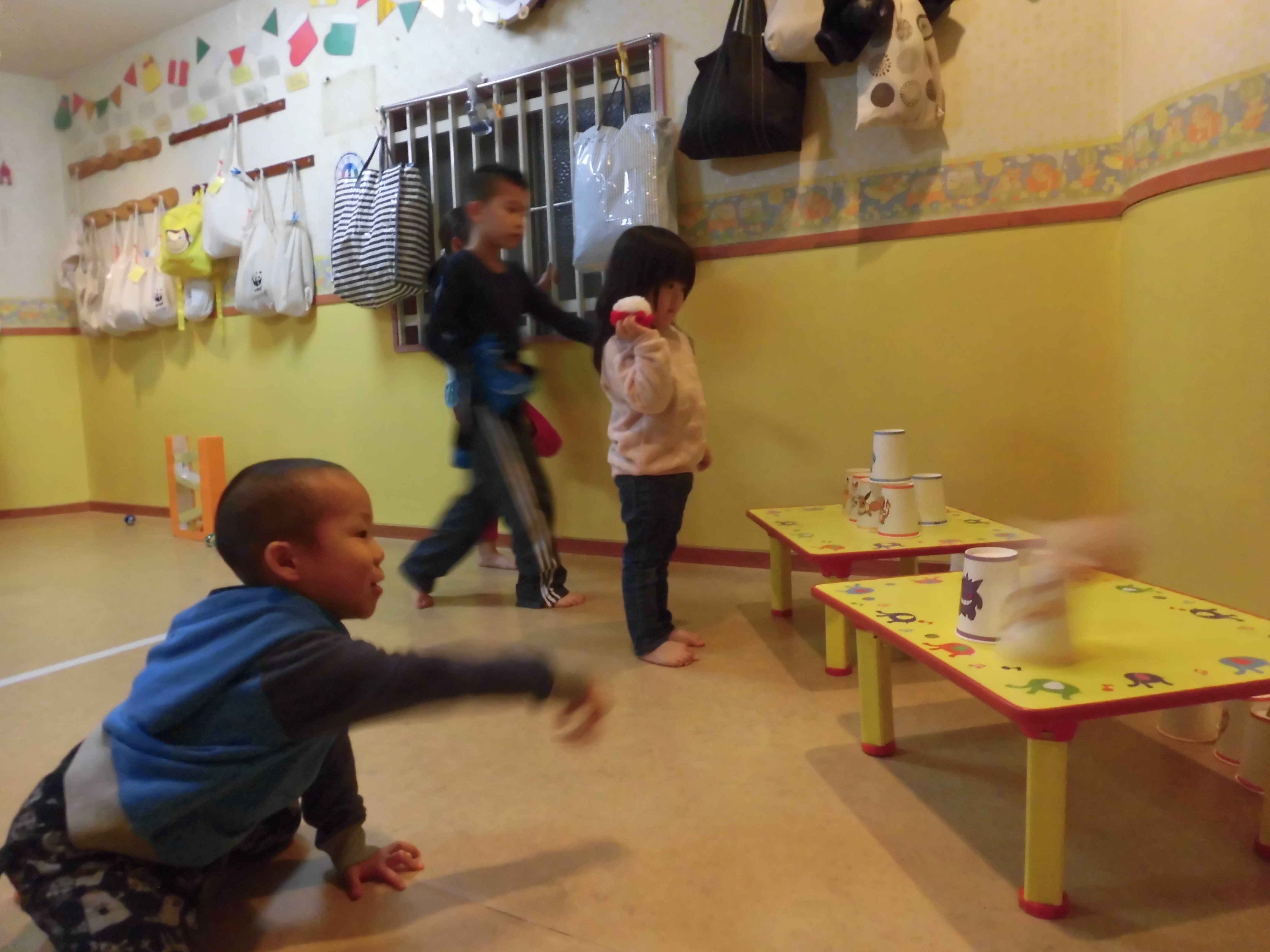 大きい子は紙コップと毛糸で作ったポンポンボールで