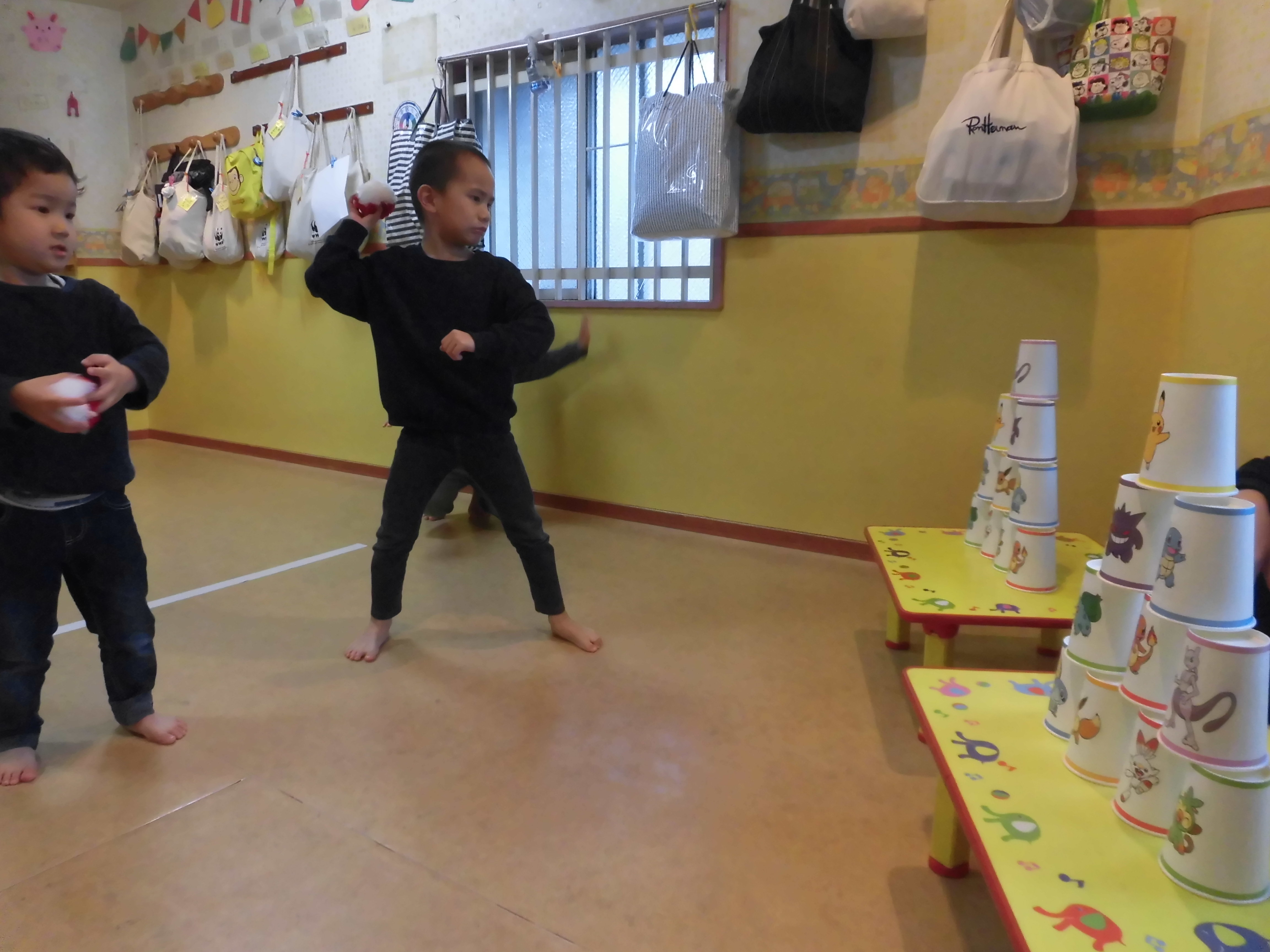 そして肝心のストラックアウトは5歳以上の子は少ない回数で全てを倒そうと「いけー‼️」と勢いよく投げつけ、3歳~4歳の子はお兄ちゃん達にアドバイスをもらったりしながら一生懸命投げていましたよ✨