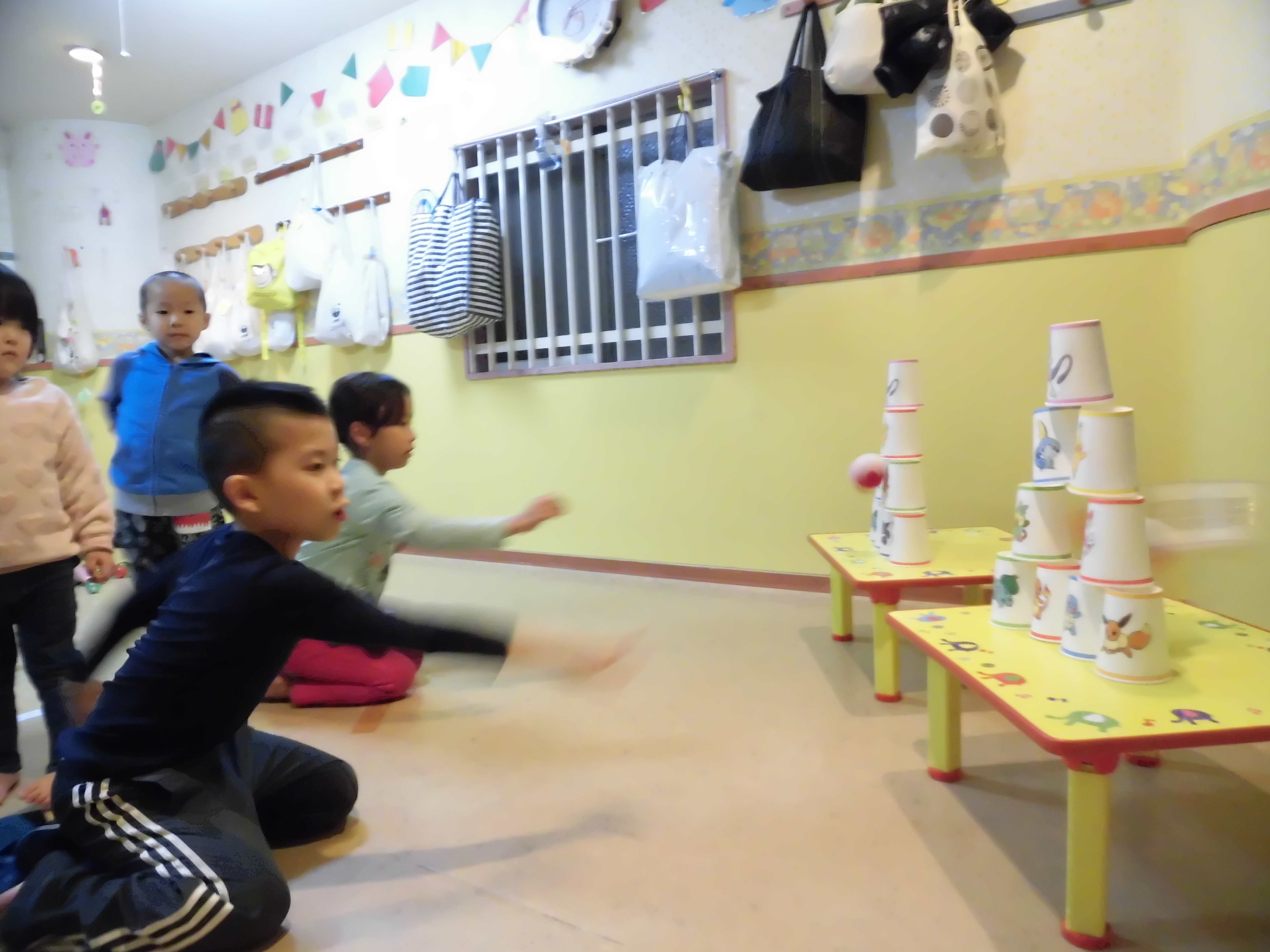 大きい子は紙コップと毛糸で作ったポンポンボールで