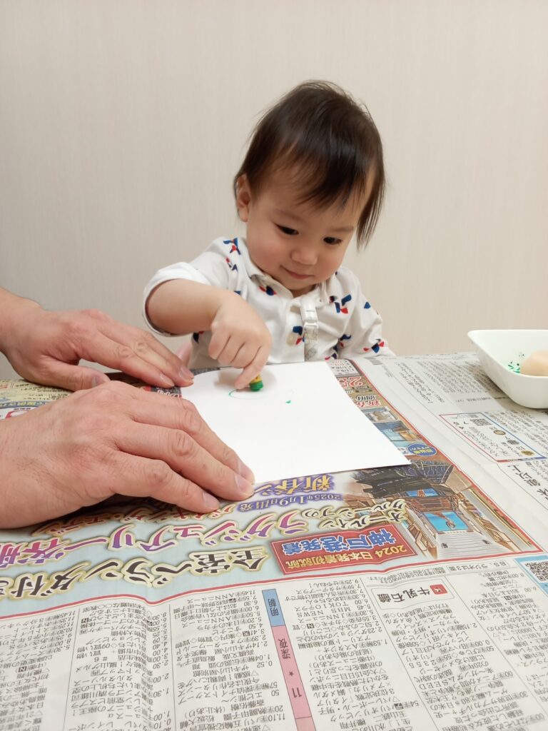 パワーが足りなかったので仕上げは、保育士と一緒にギュッギュッと押し込んでしっかりと色をつけました!
