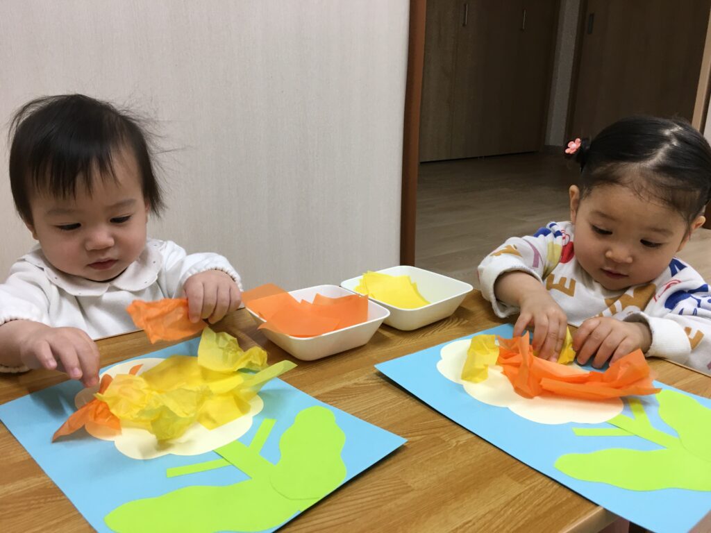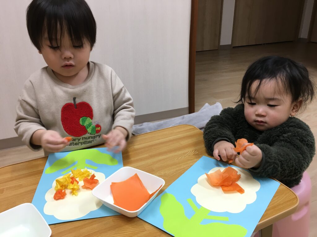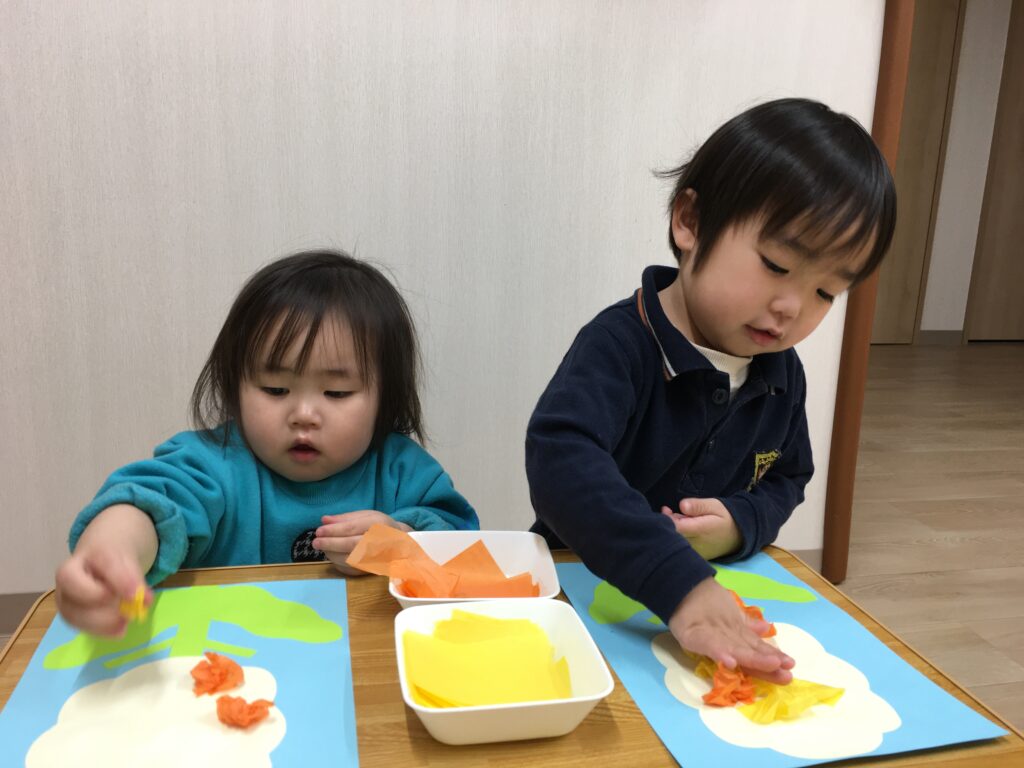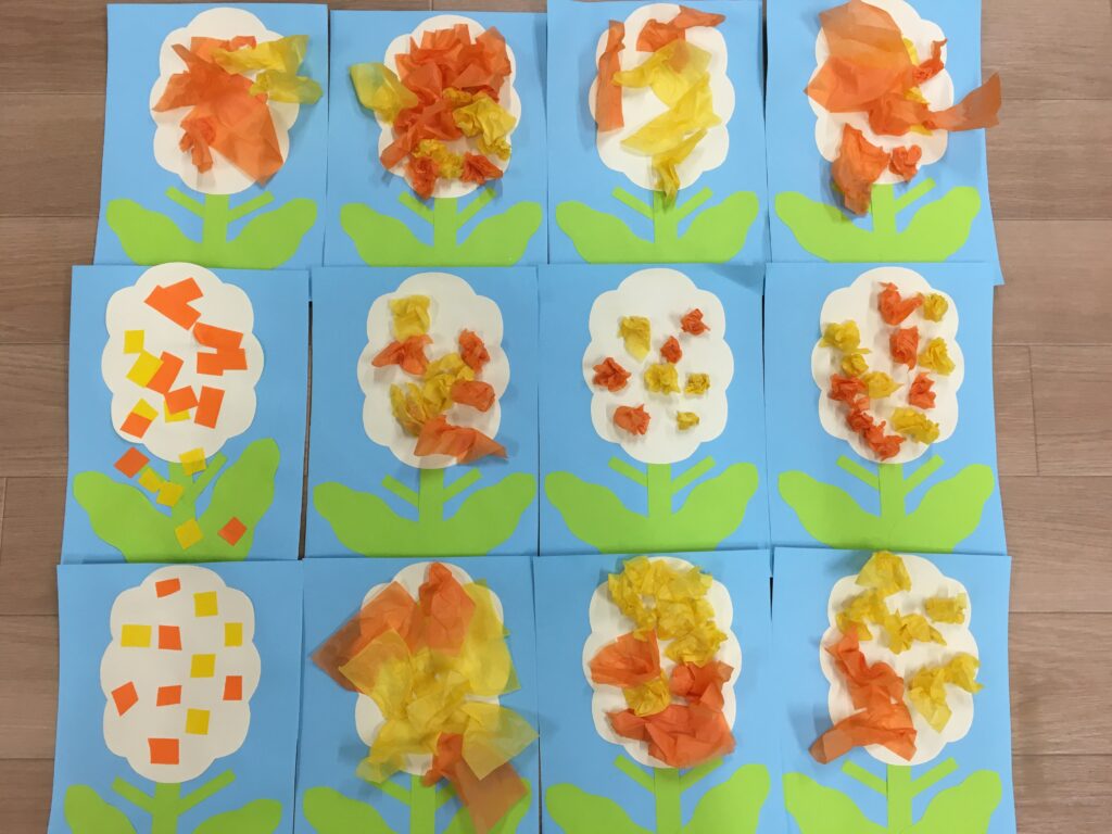 小さいグループさんは、カラーペーパーを丸めて木の用紙にたくさんお花をつけました🌼くしゃくしゃなる音が楽しかったようで両手にたくさん持ってぺたぺた貼っていました🌷