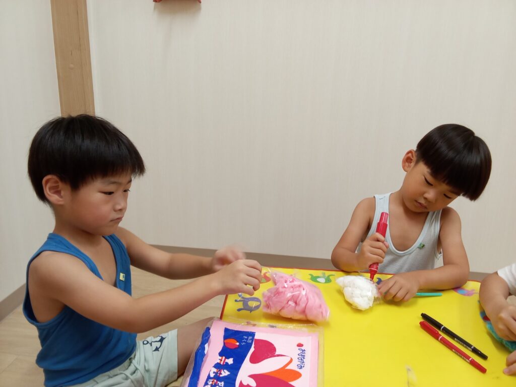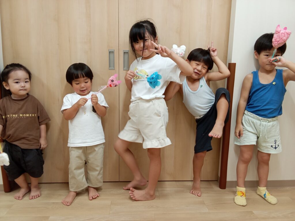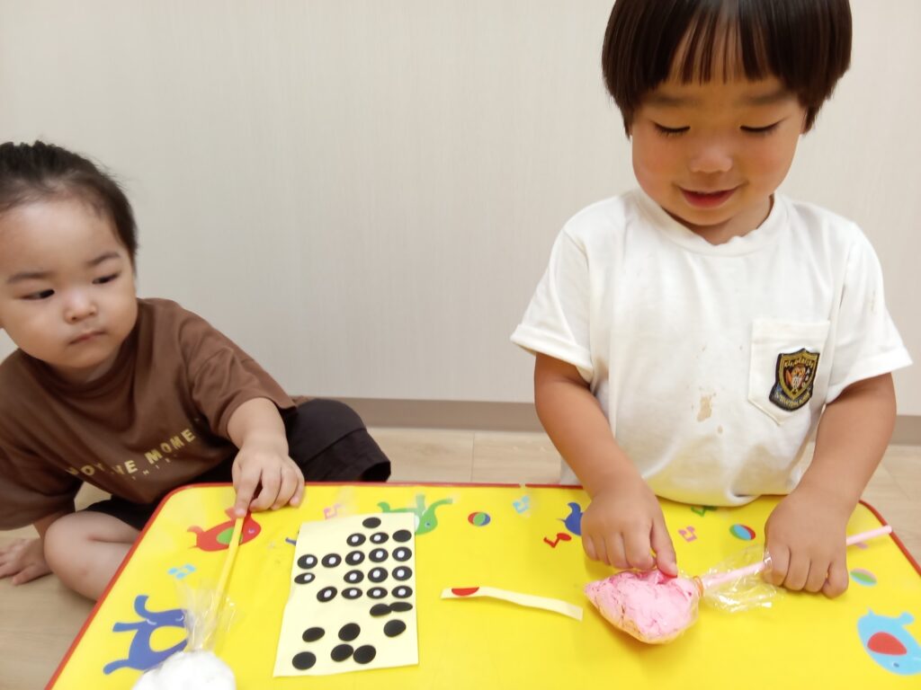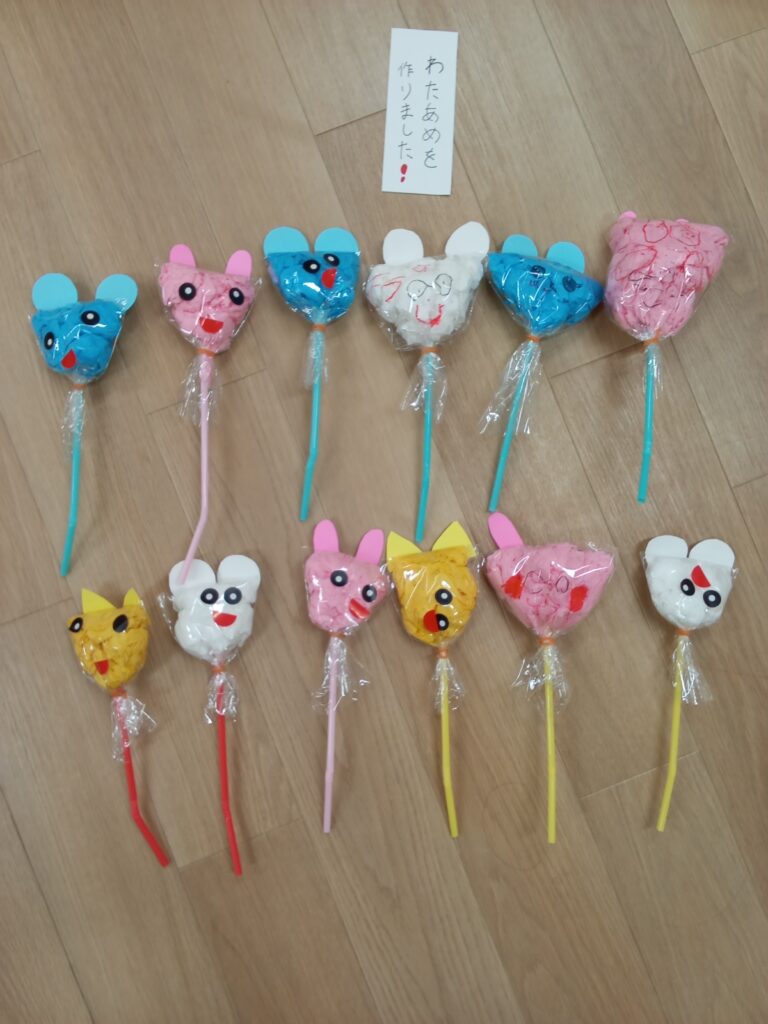 このわたあめにペンやシールを使って顔を作り、耳をつけて動物さんにしましたよ⭐