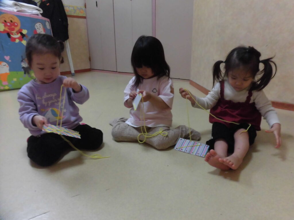 小さな穴に集中して、真剣な顔でひもを通していましたよ。