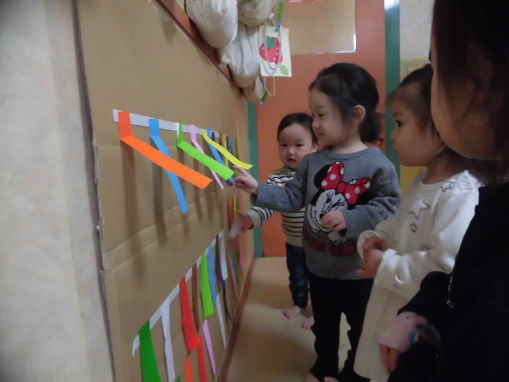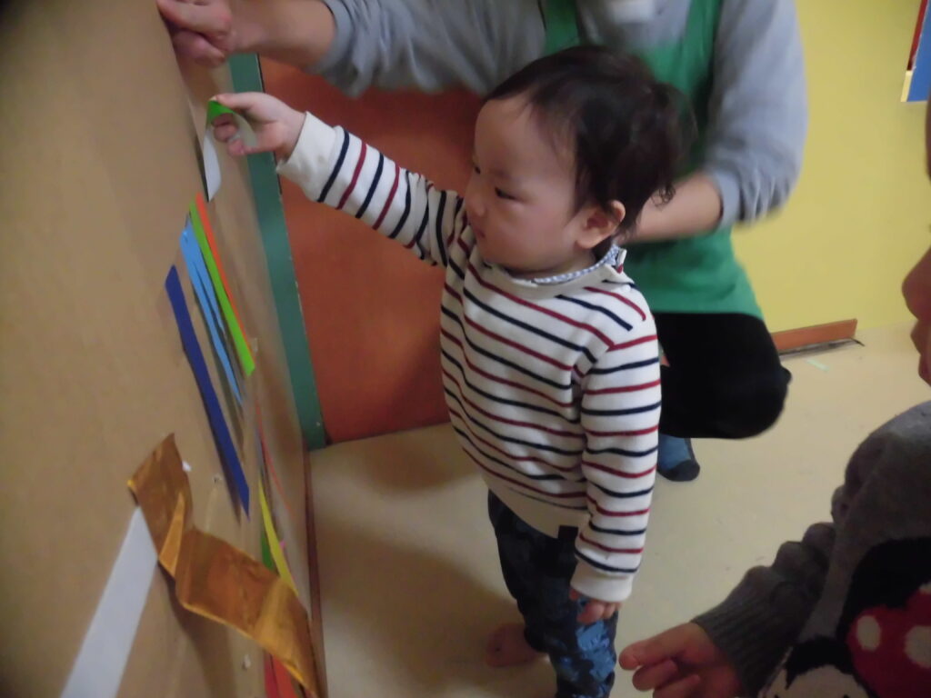 ダンボールにピラピラの折り紙をたくさん貼ってるのをちぎる遊びをしました。