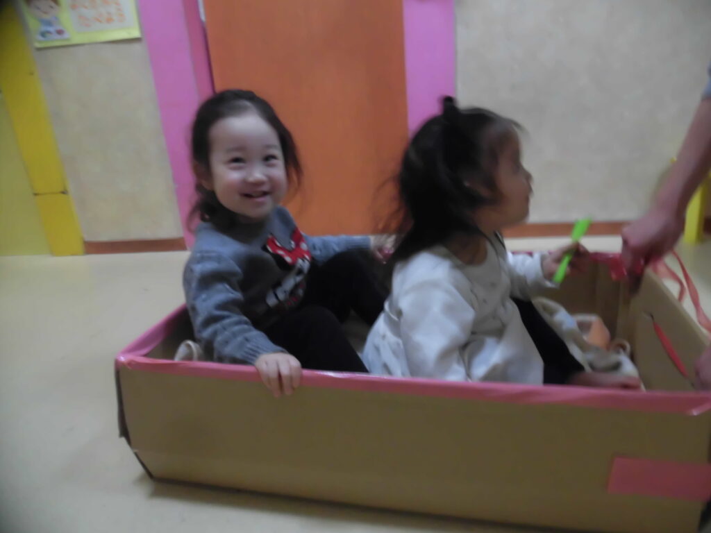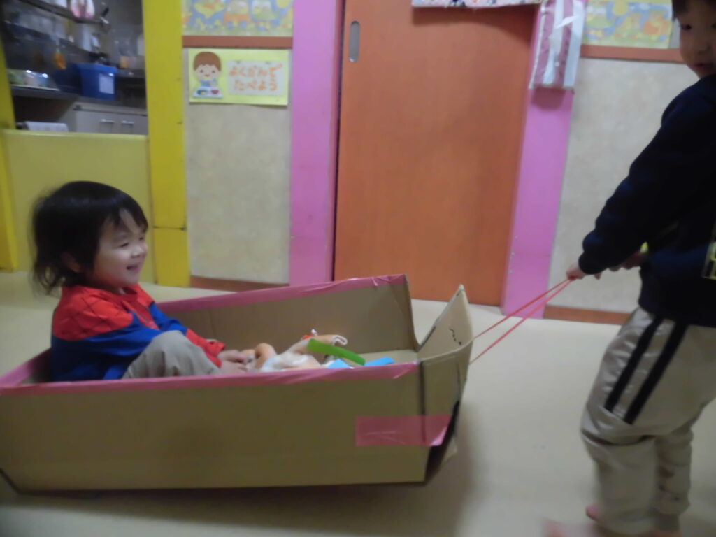 今日はダンボールをリサイクルしておもちゃにして遊びましたよ!