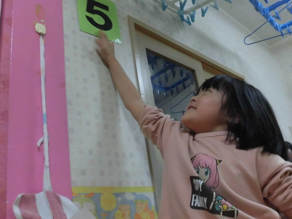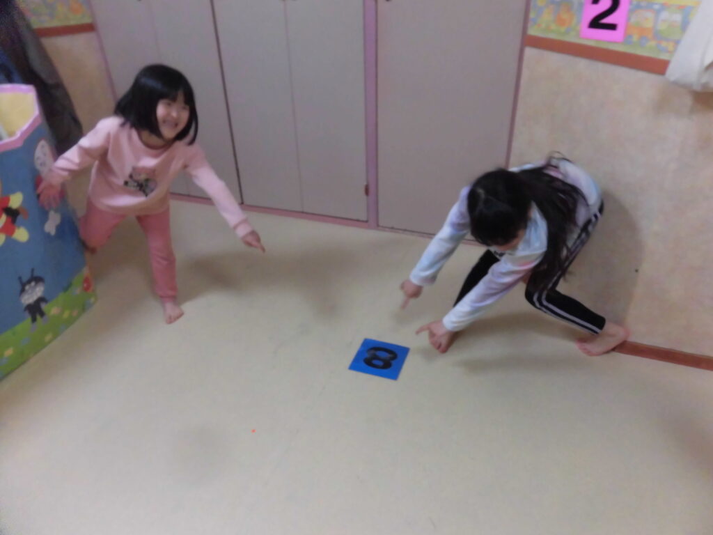 大きい子達は、お部屋に1〜9までの数字を貼って足し算や何歳?などクイズをしながら答えの数字にタッチしにいったり1〜9の数字を順番にタッチしていくスピードを競ったりして遊びました!
