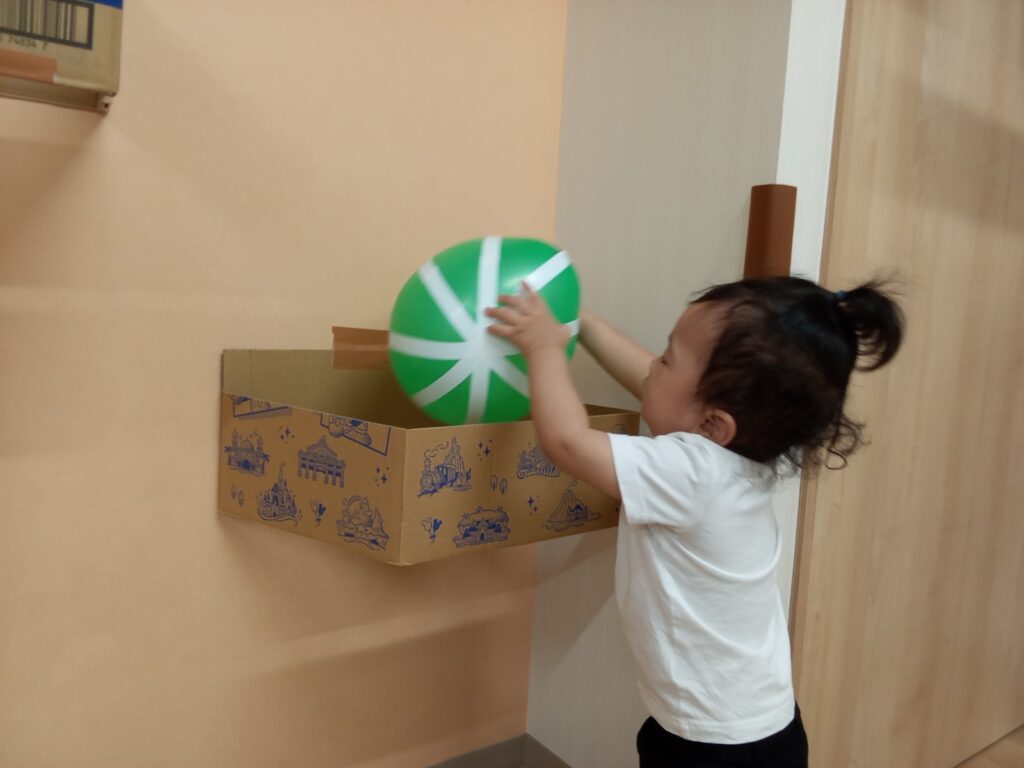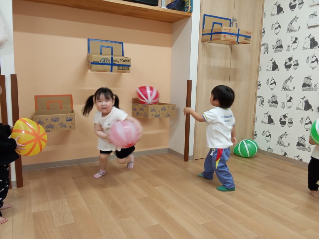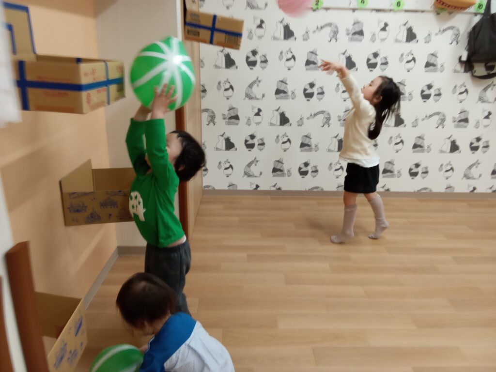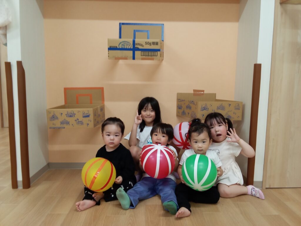 膨らました風船にビニールテープを巻いて作ったボールで段ボールのゴールにシュートして遊ぶ風船バスケで遊びました🏀🎈