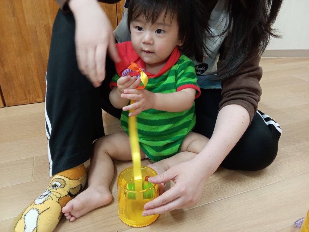 おもちゃを目の前に置くとすぐに手を伸ばして遊ぼうとしていたのですが、遊んだ場所が悪かったため目の前で遊んでいたお姉ちゃん達(真正面)を見ながら引っ張っていました😁笑