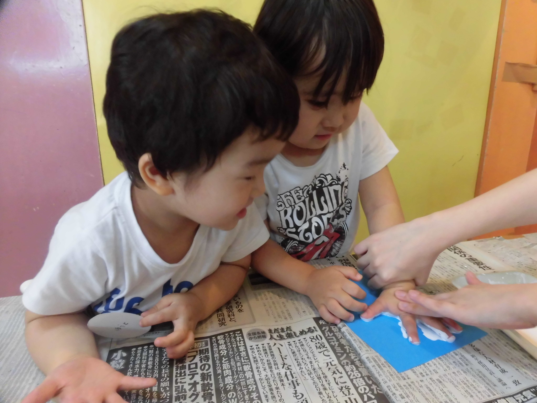 3歳以上の子ども達は手に絵の具を塗る珍しい感触にニコニコと喜んでいました?