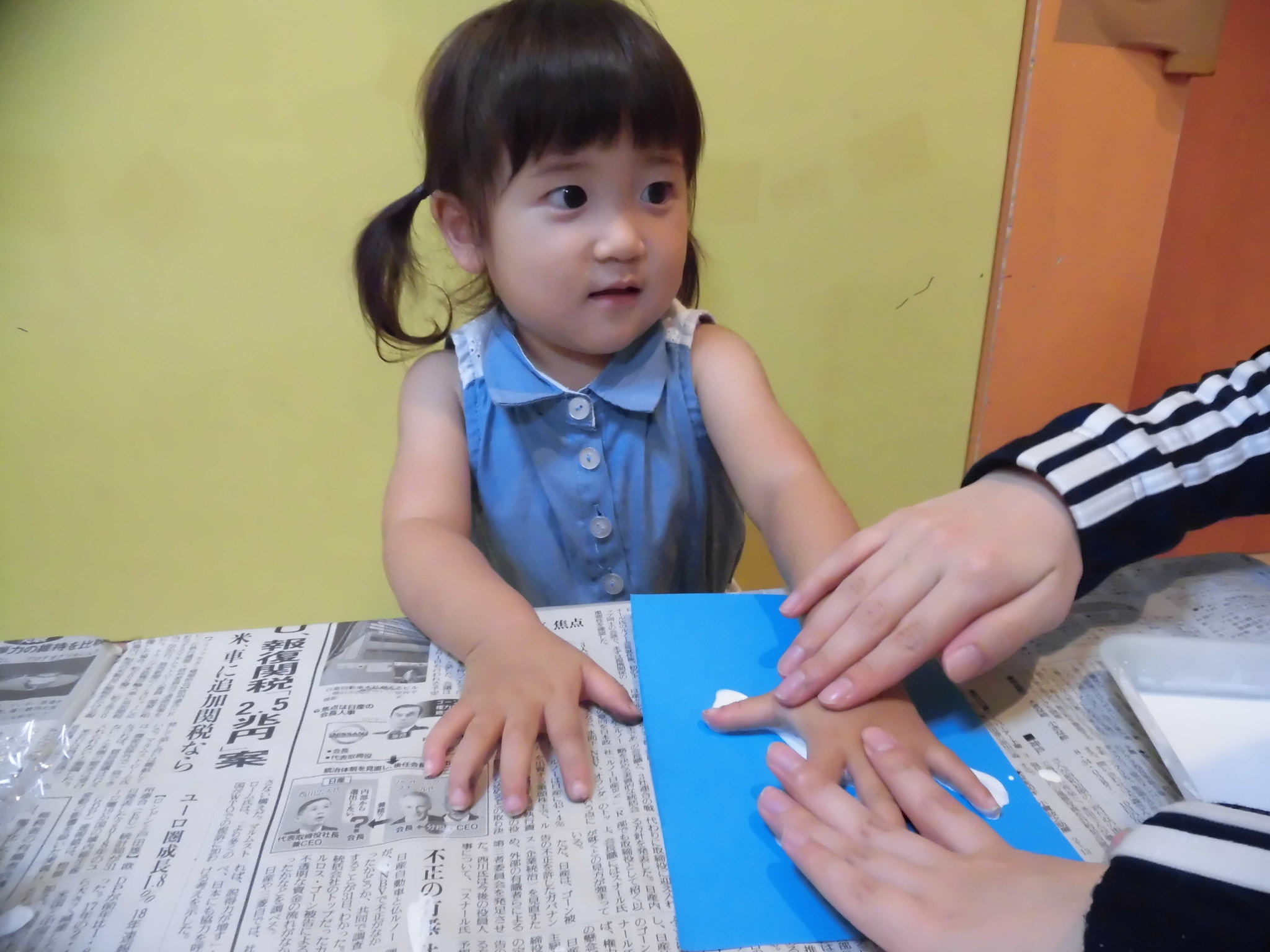 1歳2歳の子ども達は手に絵の具を付けられて、