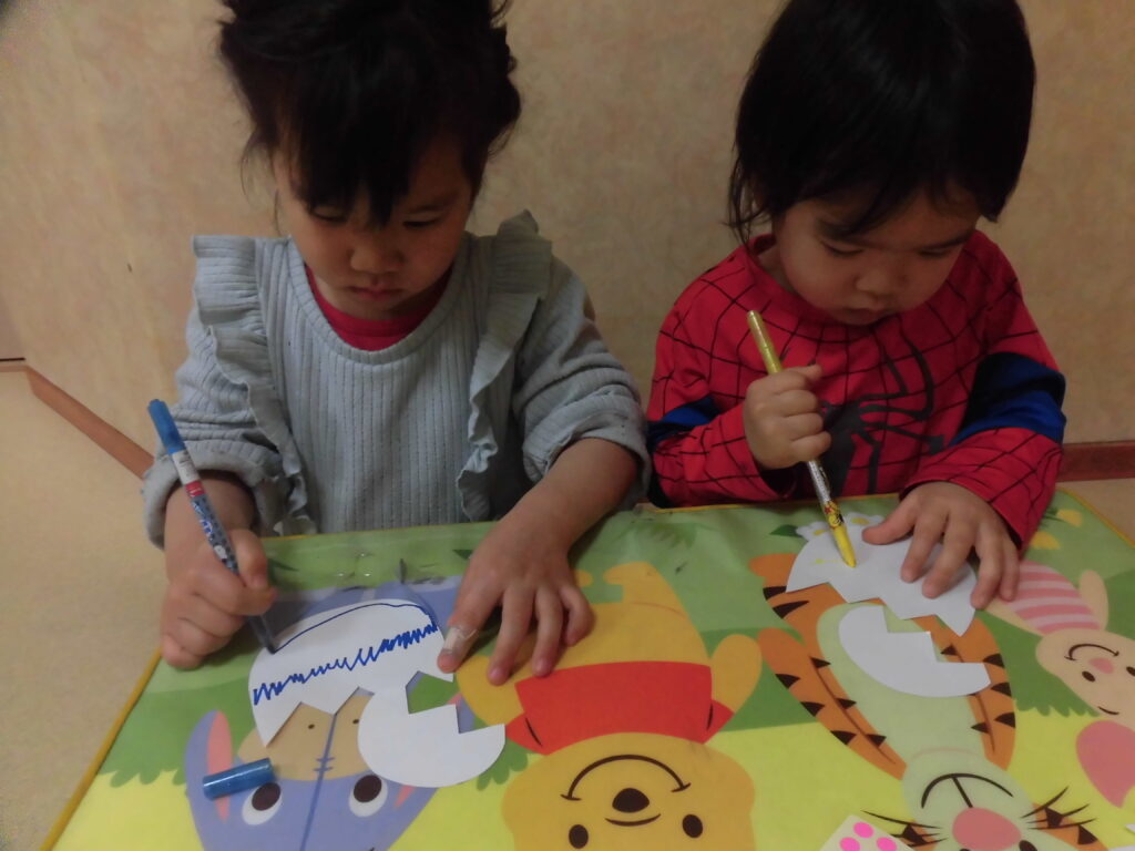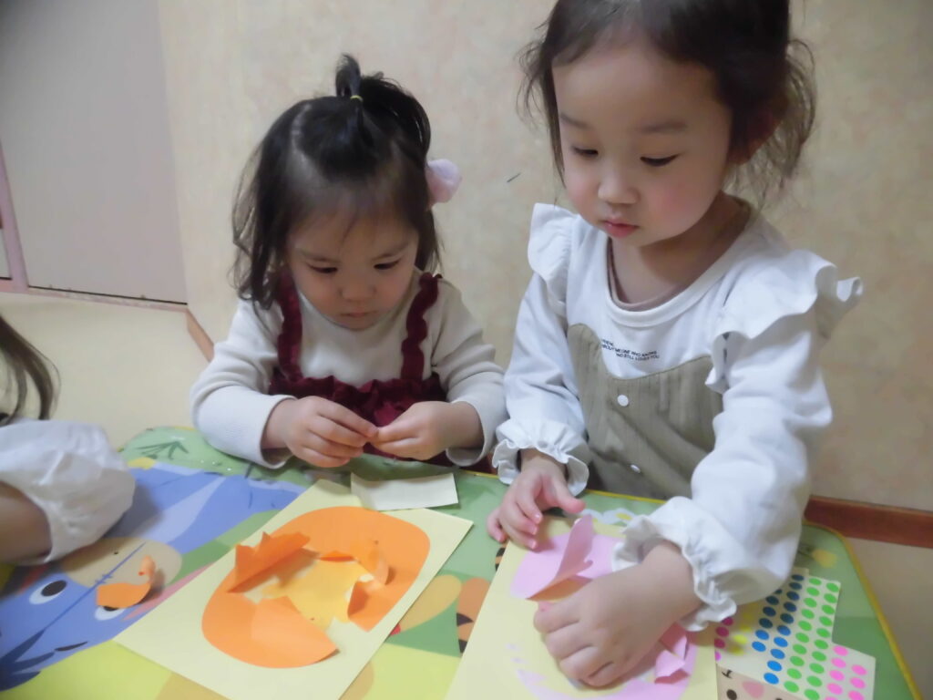 小さいグループさんは、殻を剥くように紙をめくってもらい、中に動物がいるのを見つけると、”あー!いる!”と嬉しそうにしながらビリビリめくっていました!その後はシールで可愛く模様をつけました🥰🥰