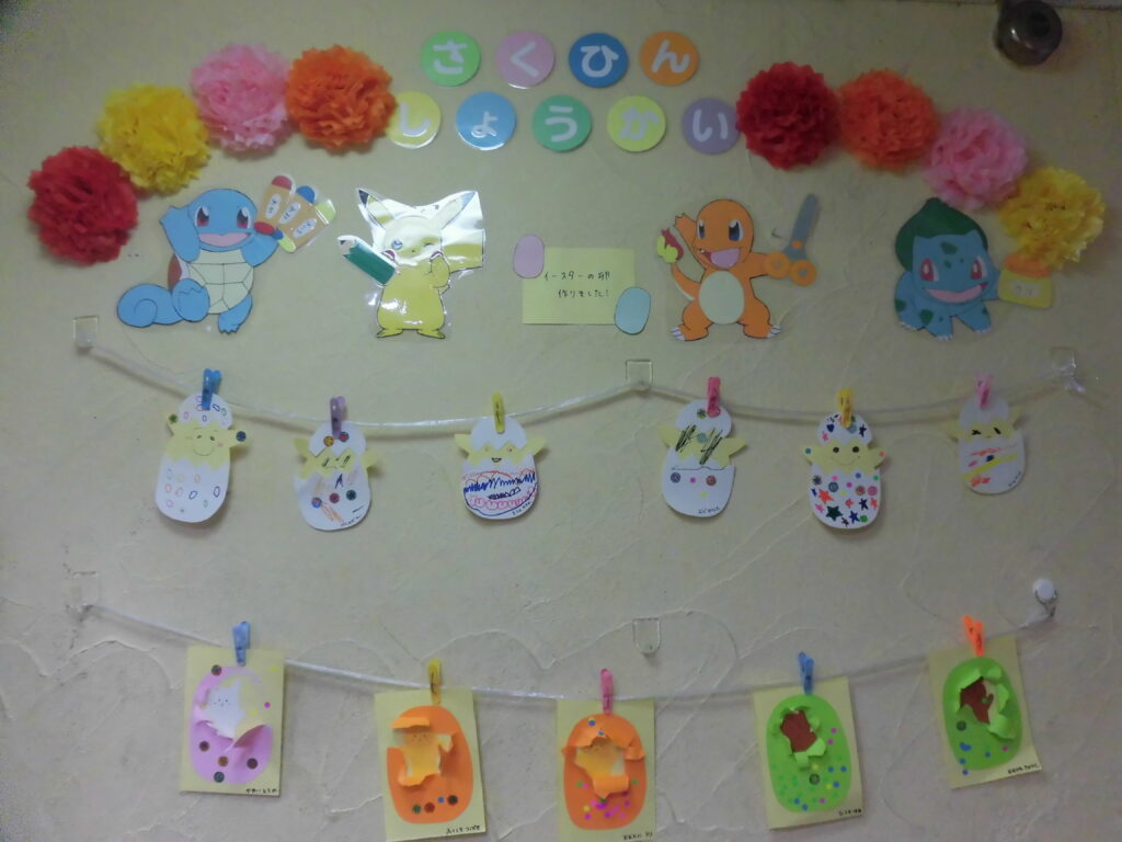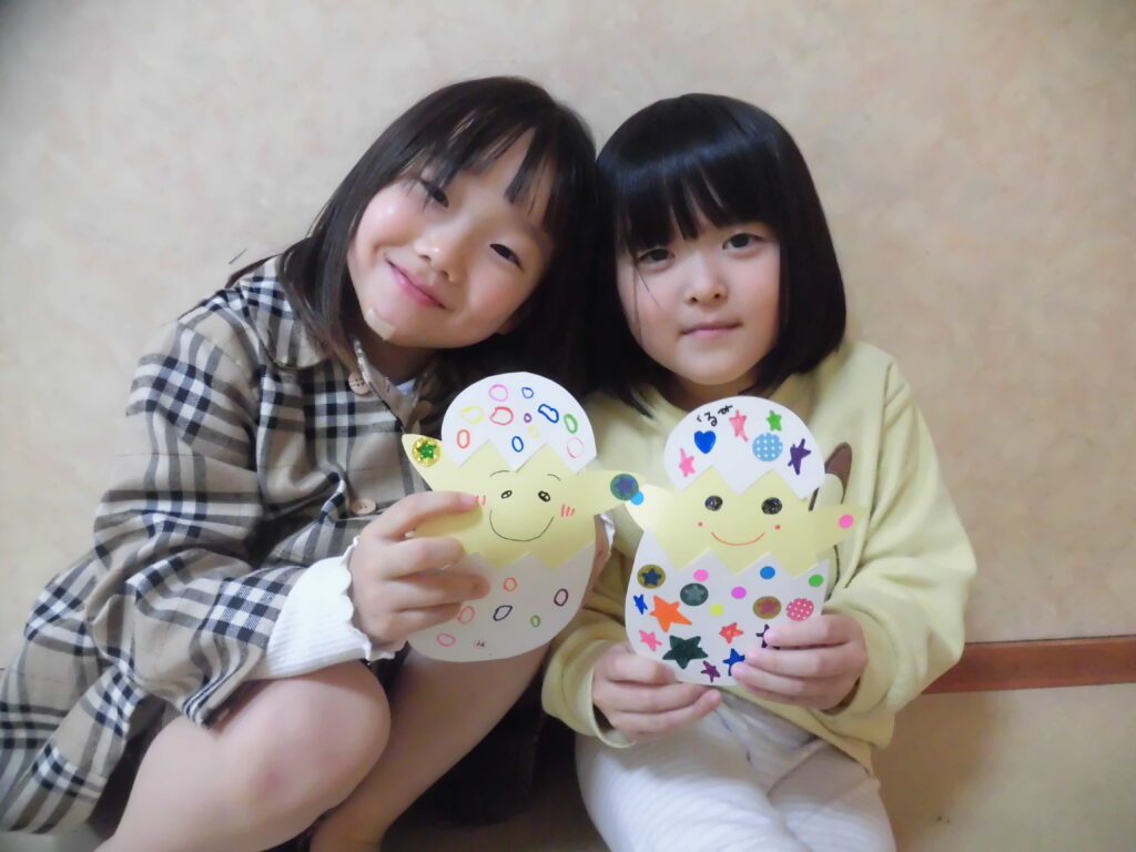 大きいグループさんは、”イースター何か知ってる!”と言いながら、それぞれペンやシールで卵に模様をつけてもらいました😊可愛く出来上がるとひよこの画用紙に上手に貼り付けていました💖