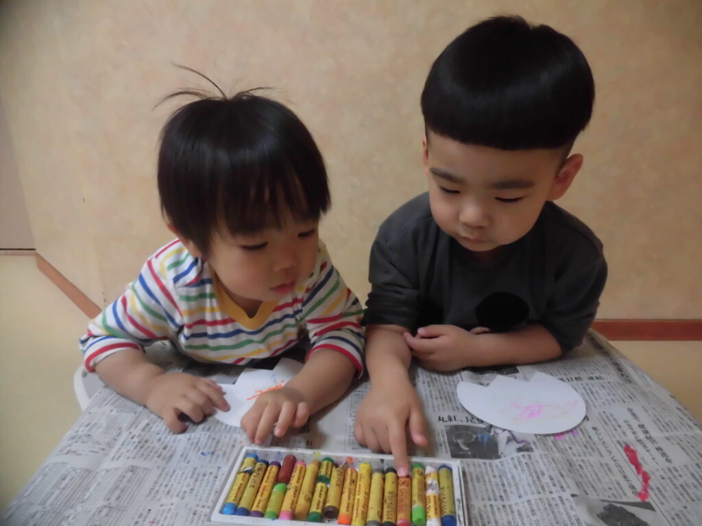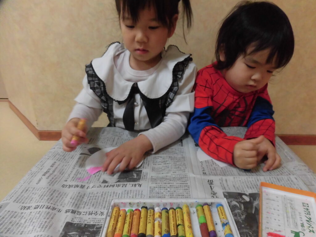 花びらの形の画用紙にクレヨンで塗って色をつけます。