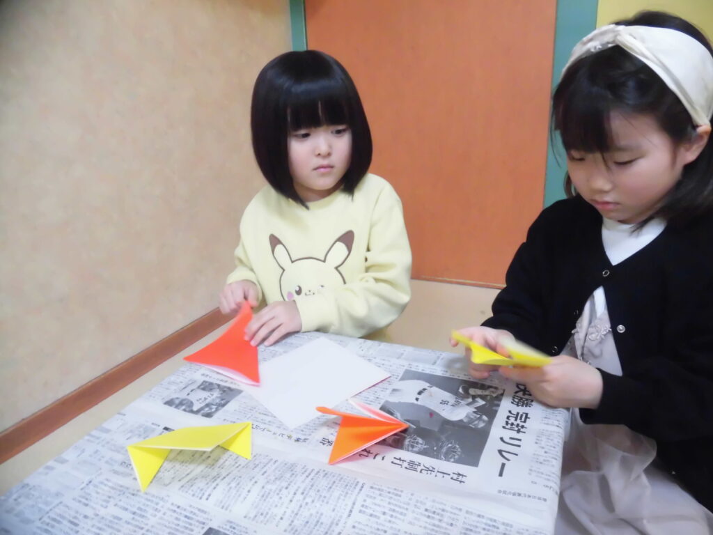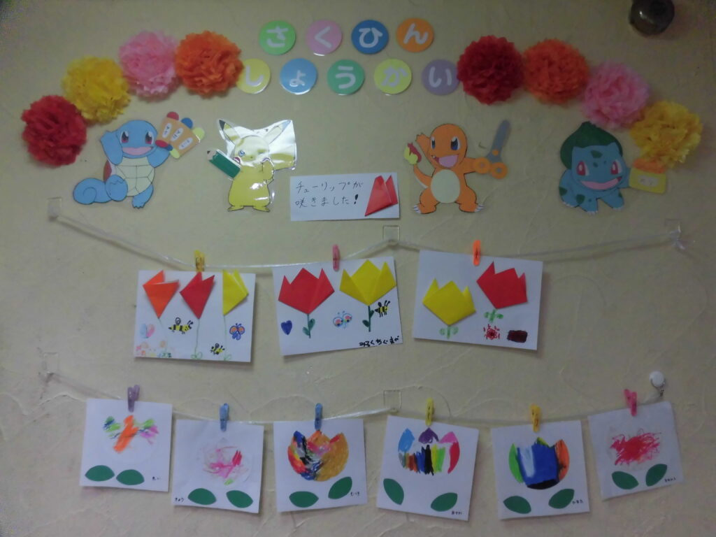 大きい子達は、折り紙でお花を折ってペンで葉っぱ🌱を描いて、チューリップ🌷を咲かせました😊