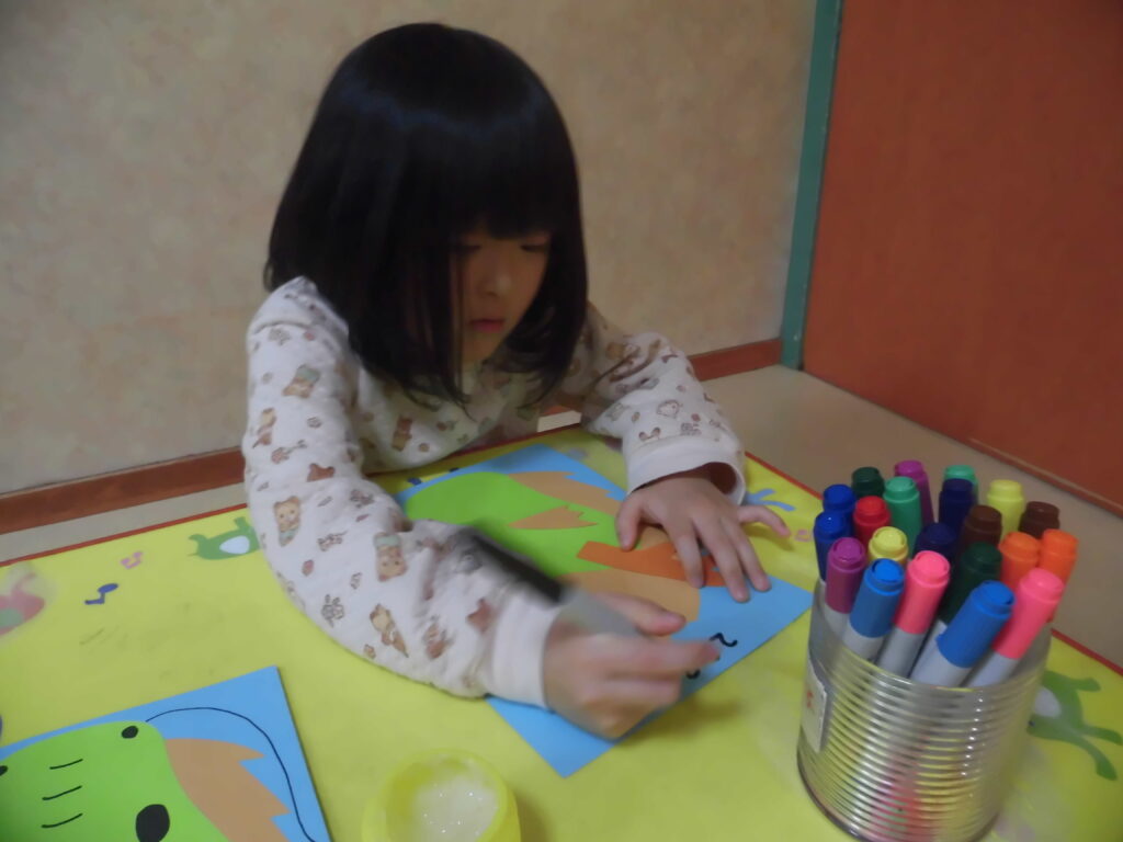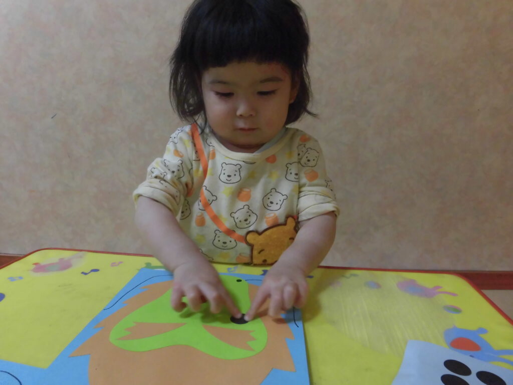 眉が全体の目に思ったようで、そこに黒シールを貼り、保育士が思ってたのとは違う目を作った子もいました(笑)