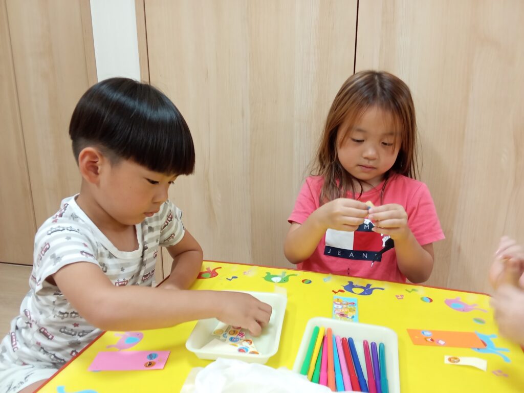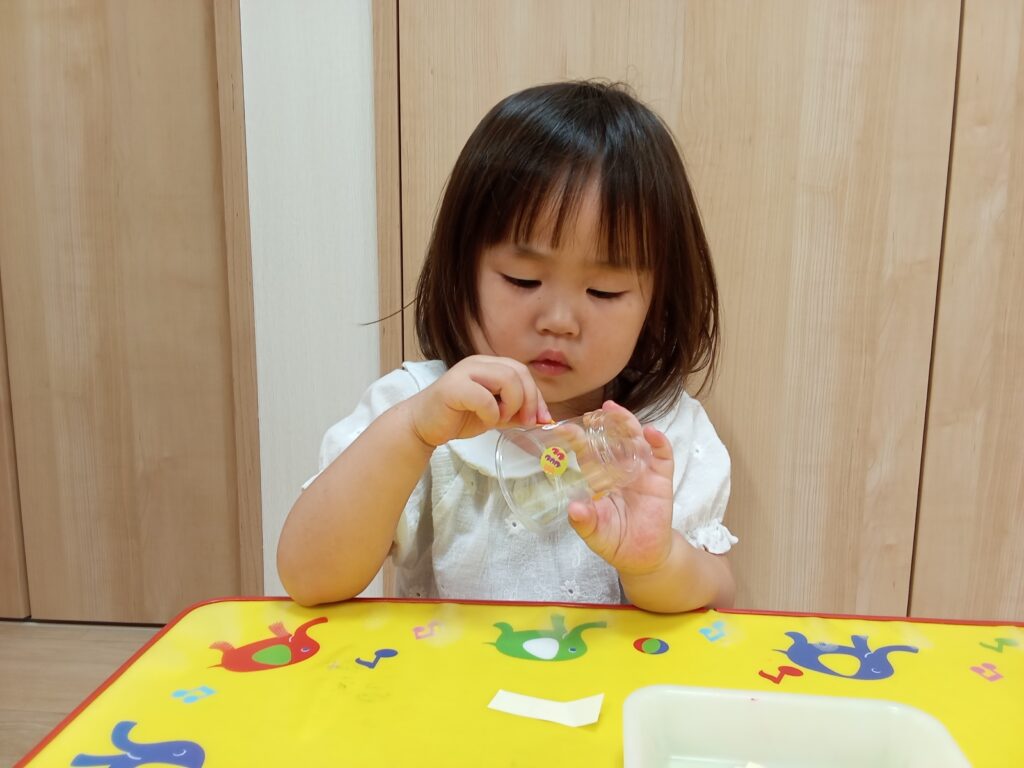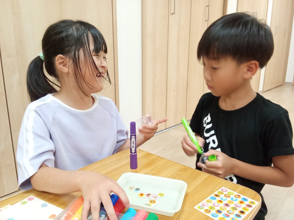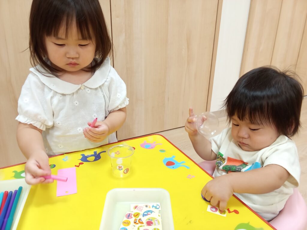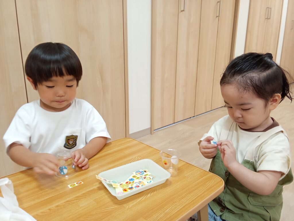 シールは、お魚の絵など描かれたシールだったので「サメにする!」「カニさん!」と嬉しそうにお話しながら貼り付けていました😊