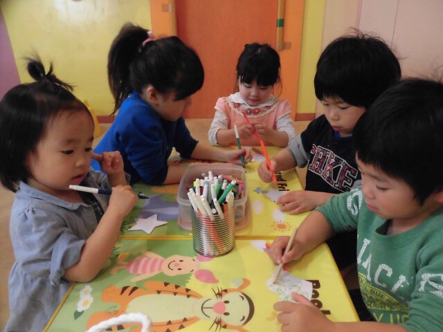 皆な上手にペンを持ちテンテンテン♪と色を付けて楽しんでいましたよ!