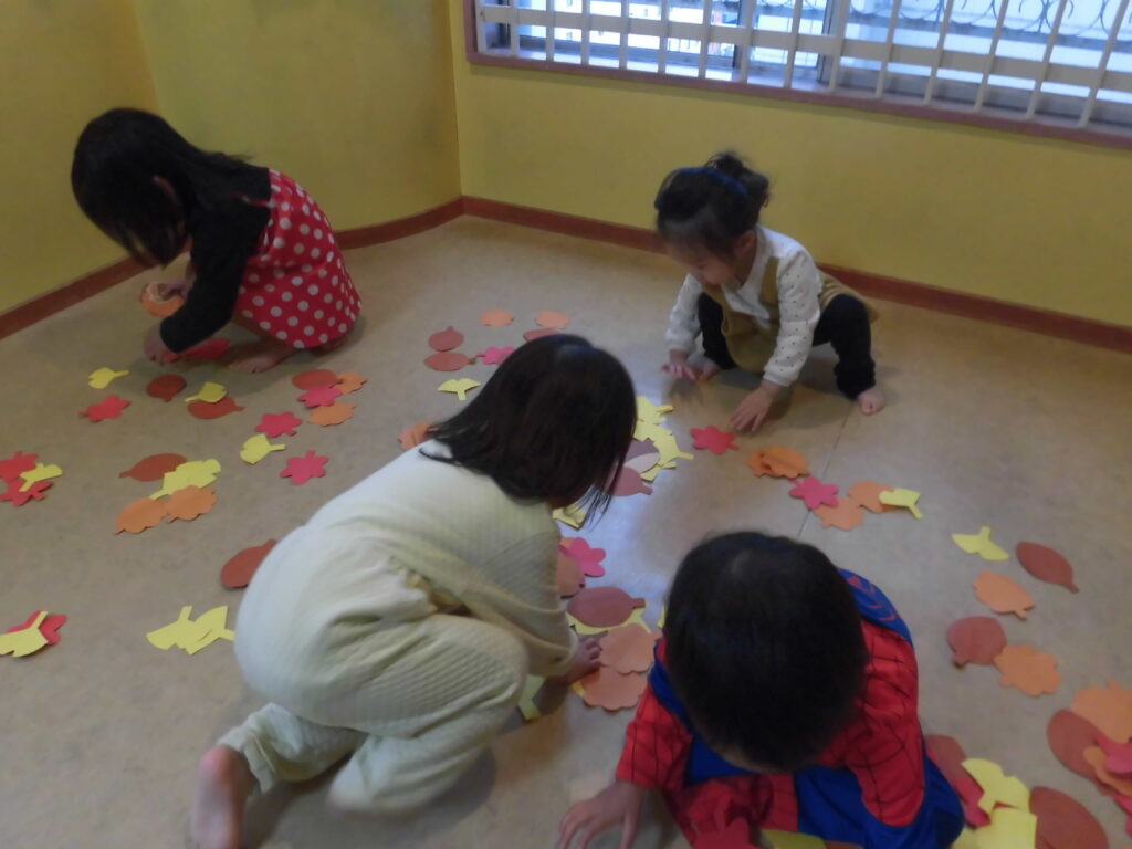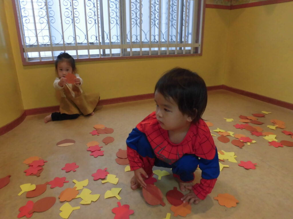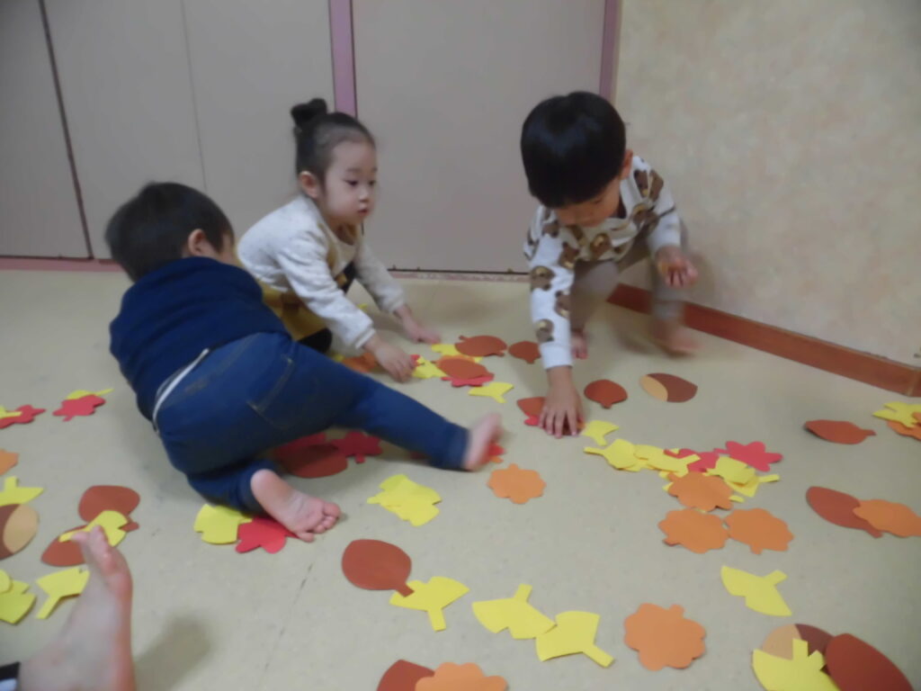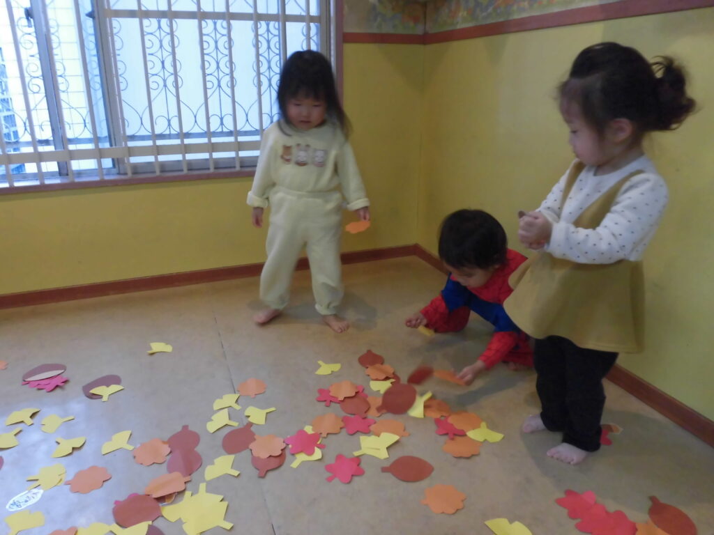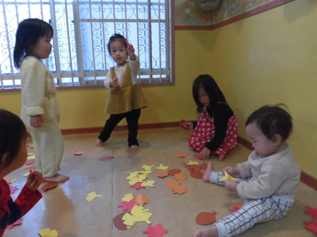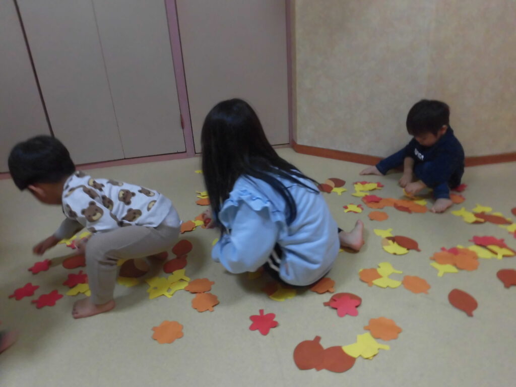 今日はたくさん落ち葉の形に切った画用紙で、落ち葉遊びをしました😊