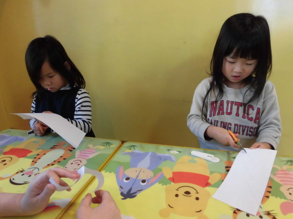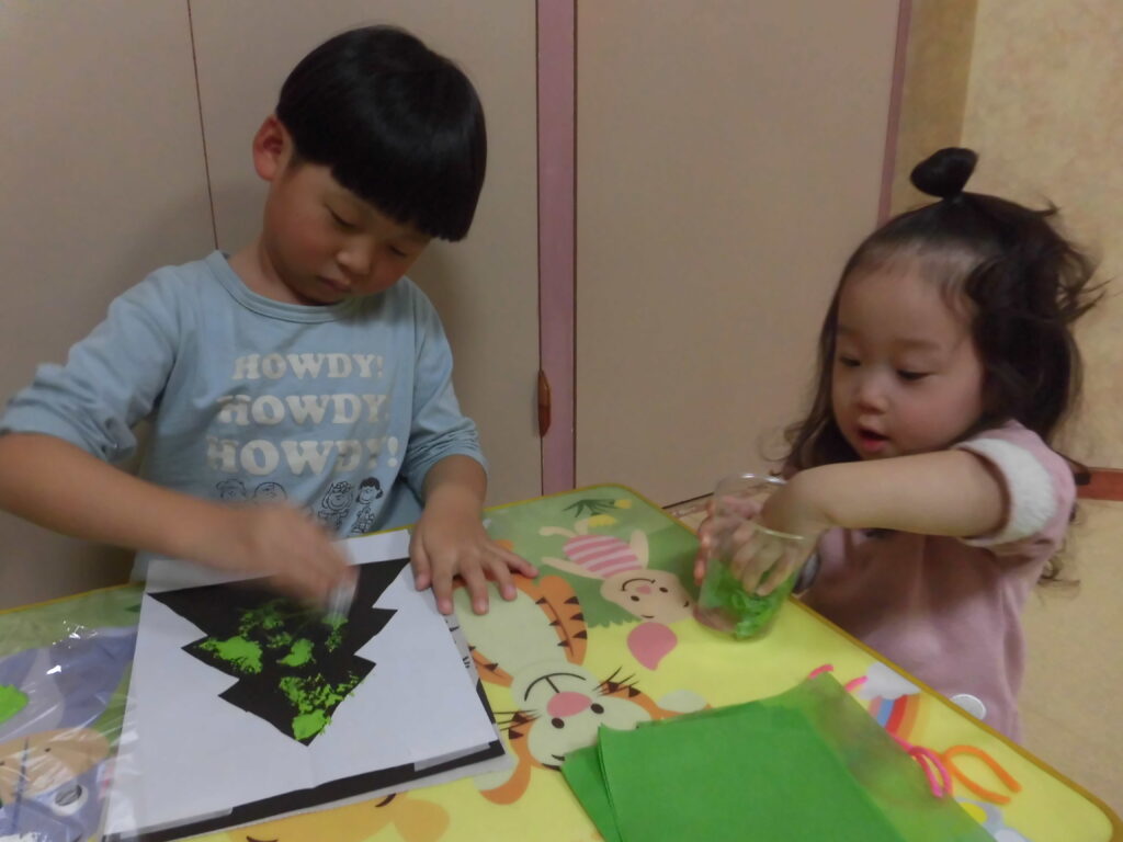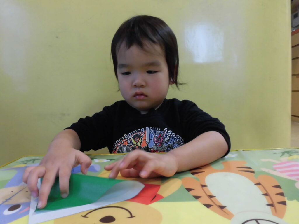 のりを塗る時、手がべたべたになるのを気にしながらも頑張って塗っていた子ども達。